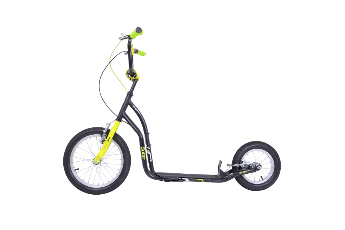 Самокат inSPORTline Suter SE — універсальний самокат для міста та легкого пересіченого рельєфу. Надувні колеса розміром 16" і 12" забезпечують достатню швидкість під час поїздок та водночас компактність для зручного перенесення й зберігання.