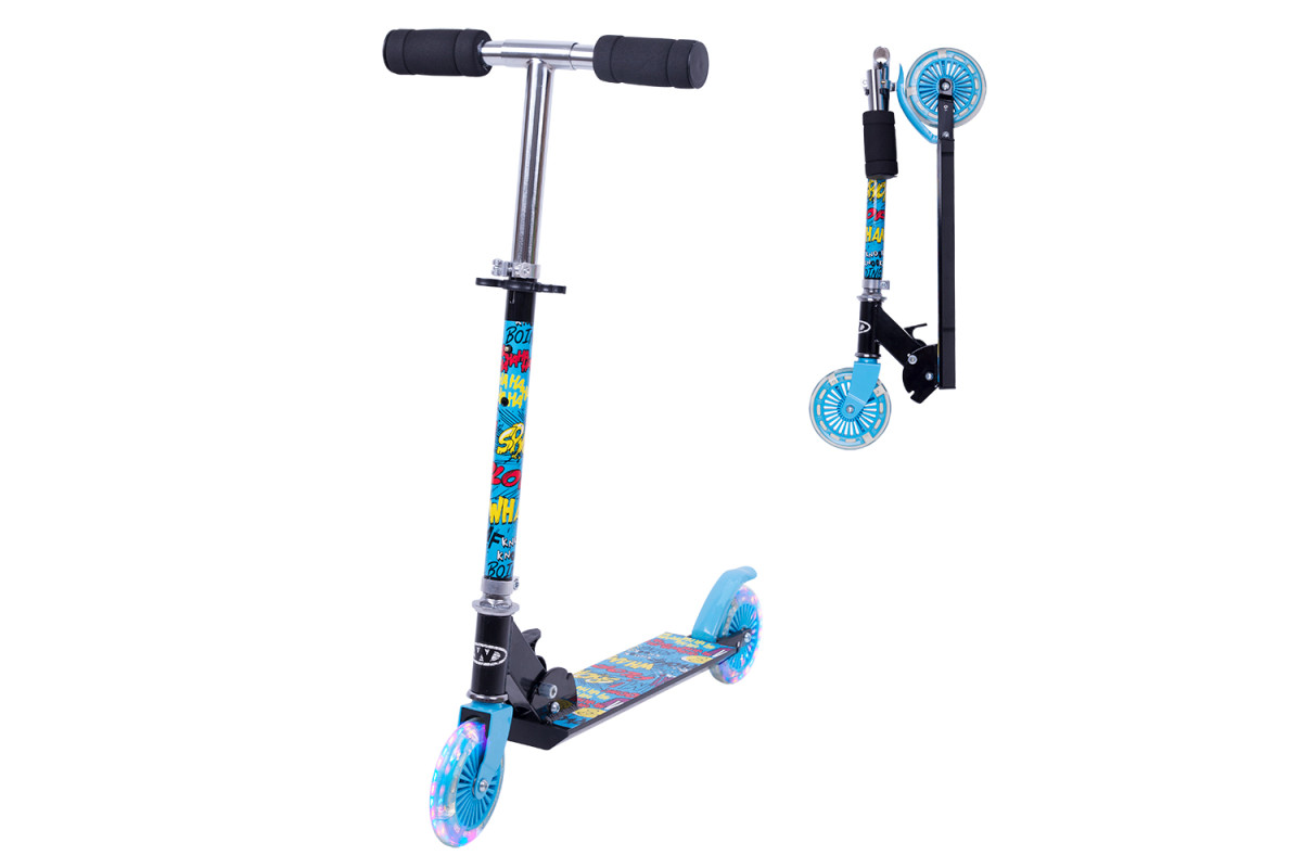 Модель виготовлена з міцного алюмінієвого сплаву та оснащена простим механізмом складання із замком, що робить її зручною для транспортування та зберігання. Особливу радість дитині подарують світлодіодні колеса, які спалахують під час рух. Барвистий ефект світла перетворює кожну поїздку на справжню пригоду.