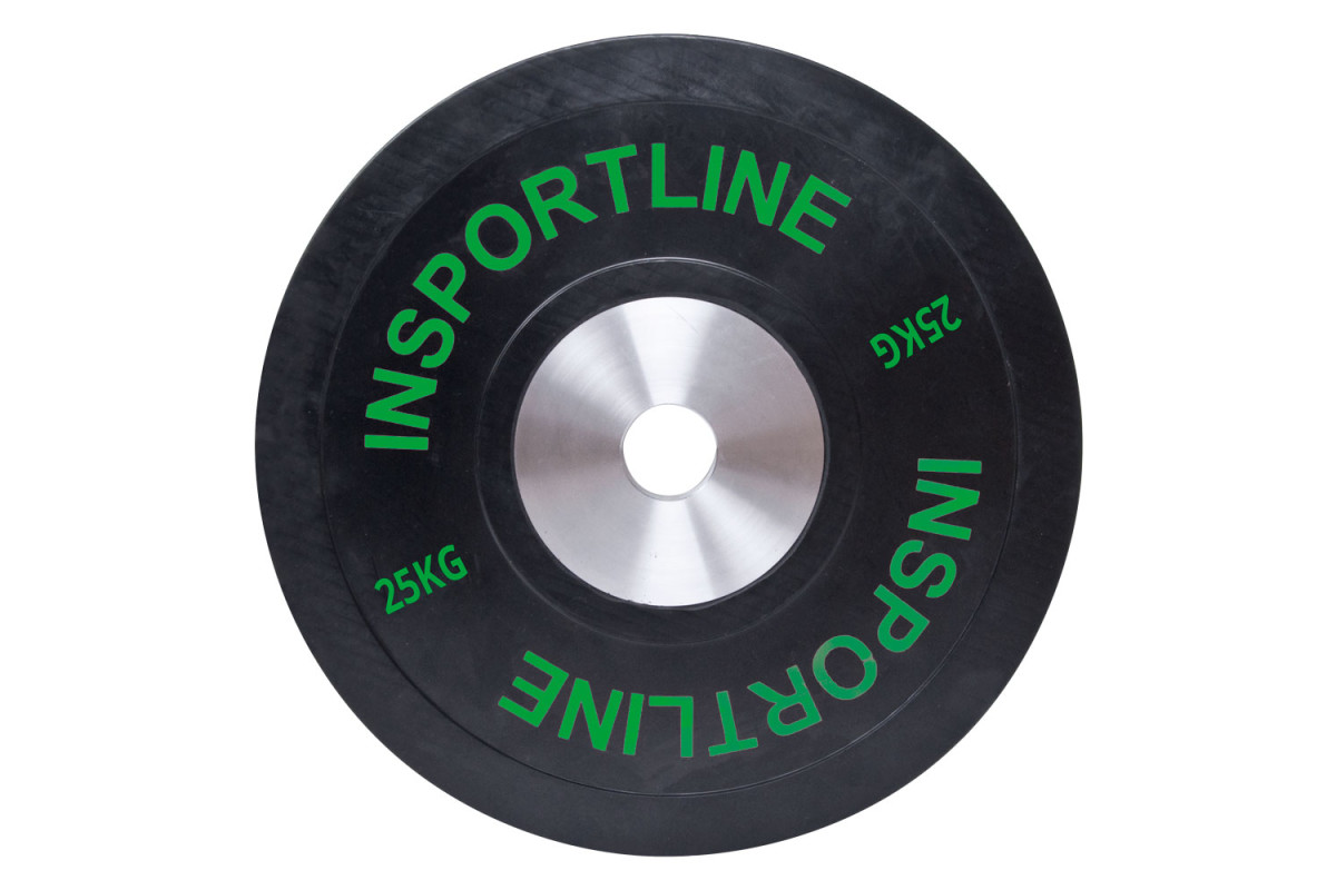 Диск чавунний обгумований inSPORTline Bumper Plate 25 кг — це бамперна плита з діаметром отвору 50 мм, яка складається з двох частин — чавунної центральної та твердої, пружної гумової кромки, виготовленої з міцної гуми, стійкої до ударів. Вагові накладки на бампері використовуються спеціально для підняття тягарів та тренувань з перехресної сили у фітнес-центрах, тренажерних залах та подібних закладах.