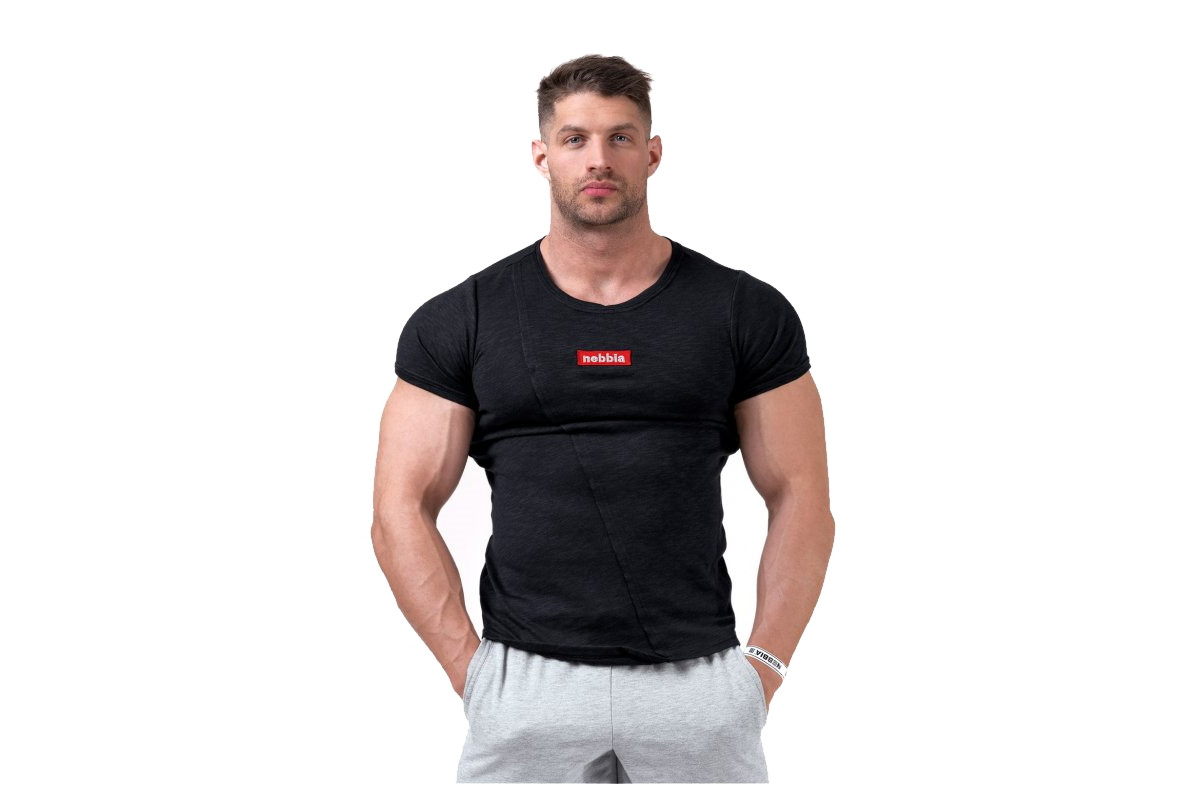 Чоловіча футболка Nebbia Red Label Muscle Back 172 незвичайна завдяки особливому дизайну спереду і ззаду. Низ футболки має ніжне закінчення у формі "V". Приталений крій підкреслить ваші м’язи, цікава текстура на спині виділить спину, а унікальна строчка спереду підкреслить весь дизайн футболки. Спереду розміщений оригінальний контрастний додаток з логотипом NEBBIA, який підкреслить весь дизайн футболки. Він буде ідеально підходить не тільки для фітнесу чи тренувань, але і для міста або вечірки.