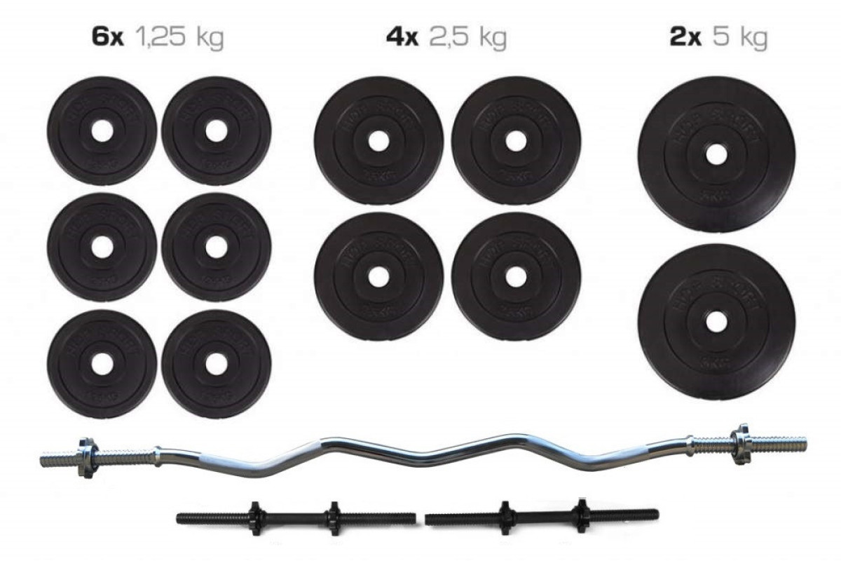 Представляємо набір навантажень з загальною вагою 36 кг. За допомогою цього набору Ви зможете повноцінно займатися зі штангою і гантелями як і в спортзалі так і в домашніх умовах. Диски підходять до прямого грифу, w-образним і до гантельным грифам тому набір вважається універсальним. Ви зможете чергувати заняття зі штангою і гантелями, тим самим рівномірно опрацьовувати різні групи м'язів.