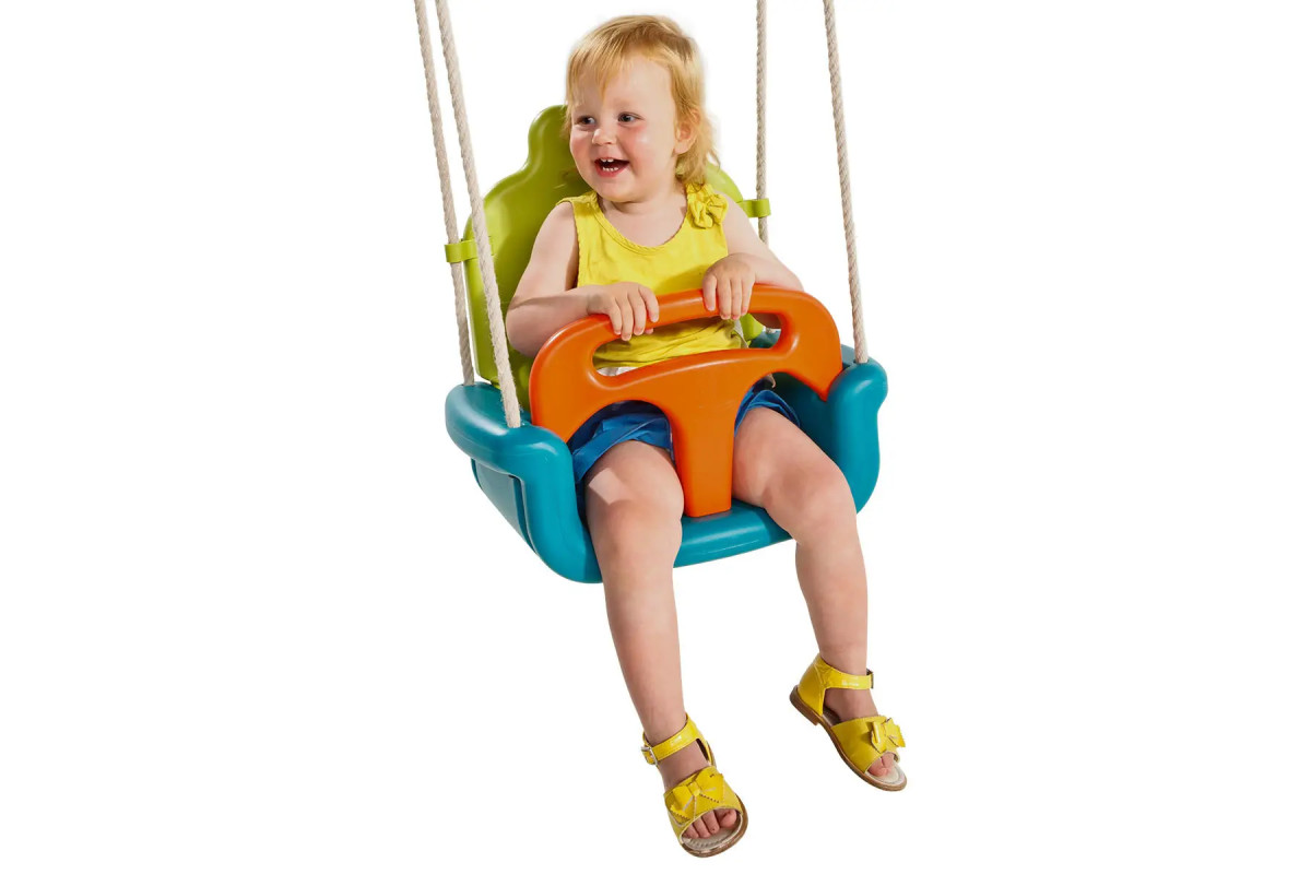 Воно має захисний ремінь із застібкою, яка надійно закріплюється при закритті. Це, без сумніву, високоякісна дитяча гойдалка, доступне на ринку. Кільця і вісімки виконані з оцинкованої сталі. Зварні шви на канатах виконані з чорного ПП.