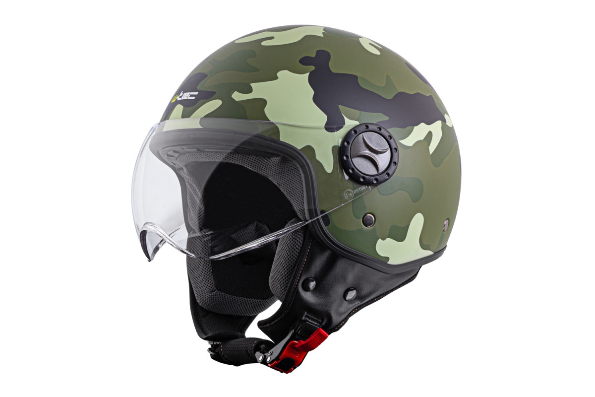 Scooter Шолом W-TEC FS-701C Camo стильний шолом. Привабливий колір доповнює простий ретро-дизайн шолома. Широкий відкидний козирок із покриттям проти подряпин забезпечує хороший зір. Зручна, м’яка внутрішня підкладка повністю знімається і миється. Самокат шле W-TEC FS-701C Камо закривається з швидким вивільненням мікрометричною пряжкою.