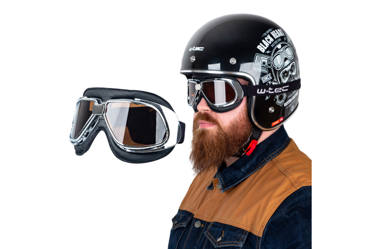 Стильний вінтажний дизайн, хромована оправа та коричневі лінзи привертають увагу! Лінзи великі, тому вони забезпечують широке поле зору, тому ви завжди будете знати, що відбувається на дорозі. Підкладка з пінопласту товщиною 15 мм забезпечує найкращий комфорт при носінні, а синтетична шкіра доповнює класичний вигляд окулярів. Вбудовані вентиляційні отвори забезпечують циркуляцію повітря і запобігають запотіванню лінз. Більше того, лінзи також мають покриття проти запотівання. Силіконова стрічка на внутрішній стороні ремінця регулюється по довжині, щоб утримувати окуляри на шоломі/голові. Стильні мотоциклетні окуляри W-TEC Atavist перенесуть вас у старі добрі часи завдяки сучасним технологіям!