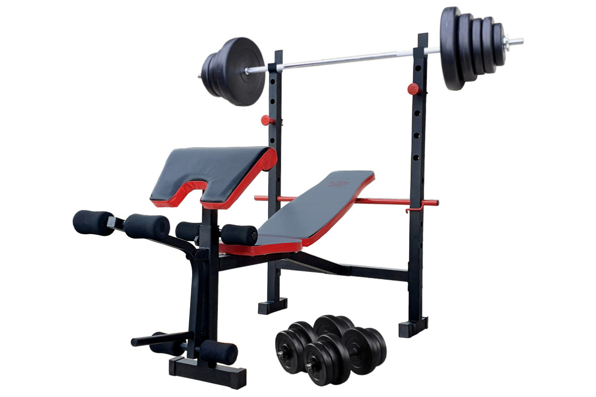 Диски : На штангу 2х1,25 кг, 2х2,5 кг; 2х5 кг; 2х10; 2х15 кг На гантелі 4х5 кг, 8х2.5 кг Всі диски покриті ударостійким ABS пластиком