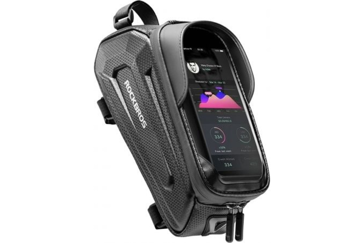 Водонепроникна велосипедна сумка від Rockbros - ідеальний аксесуар для кожного любителя двох коліс. Сумка кріпиться на раму велосипеда, яка також є зручним місцем для зберігання та чохлом для нашого смартфона. Оснащений прозорим віконцем, чохол дозволяє використовувати телефон (розміри: 18х9 см) в дорозі, як навігацію або музичний плеєр, тому що сумка також має вихід для навушників. Усе це без зупинки. Тримач виготовлений з увагою до деталей з високоякісного матового і твердого ПК, завдяки чому вам не доведеться турбуватися про свої гаджети при ударах або падіннях на бік.
