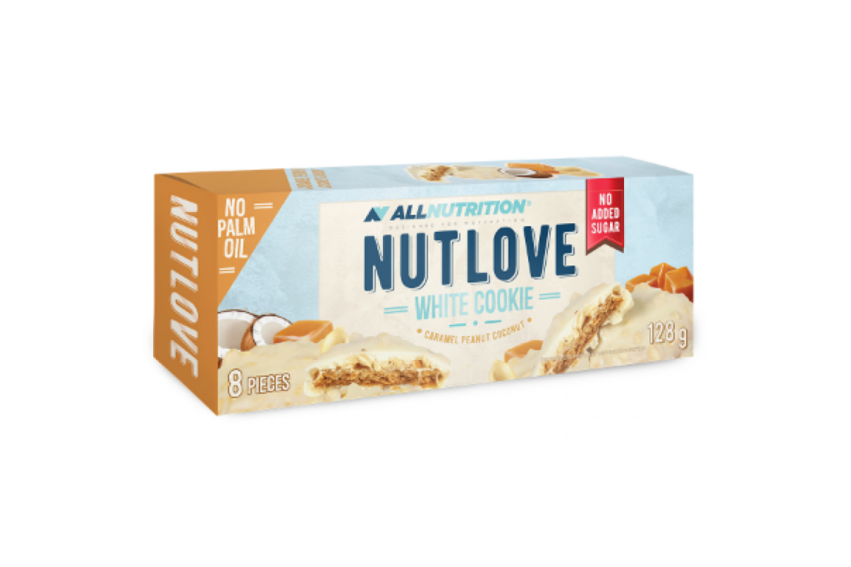 ALLNUTRITION NUTLOVE WHITE COOKIE CARAMEL PEANUT COCONUT - неймовірно смачне кокосове печиво з ароматною карамеллю та арахісом у молочній глазурі. Їх дивовижний смак натхненний нашими кремами NUTLOVE! NUTLOVE WHITE COOKIE CARAMEL PEANUT COCONUT виготовлено з інгредієнтів найвищої якості! Звичайно, вони є підходящою версією печива, адже ми не додавали до них ні пальмової олії, ні цукру — підсолодили МАЛЬТИТОЛОМ! :) Печиво NUTLOVE WHITE COOKIE - це не тільки смачна, але й корисніша заміна популярному печиві! Ідеально підходить для струнких гурманів! :) Чи існує ідеальний перекус? Просто так! Печиво із серії NUTLOVE чудово підійде до ранкової кави, як перекус протягом дня або як заслуженої нагороди після важкої роботи на тренуванні! ♥ Їхній дивовижний смак зробить ваш відпочинок особливим! Чому? Переконайтеся самі та спробуйте нашу новинку, яка тане у роті! :) Вони виглядають дуже апетитно і... ДОБРЕ СМАЧУТЬ СВІТ! :) Поживна цінність: 100 грам Енергетична цінність 2026,411 кДж / 484 ккал Жири 31г - у тому числі насичені 17г Вуглеводи 52 г - у тому числі цукру 4,6 г - включаючи поліоли 27г білок 9,1 г