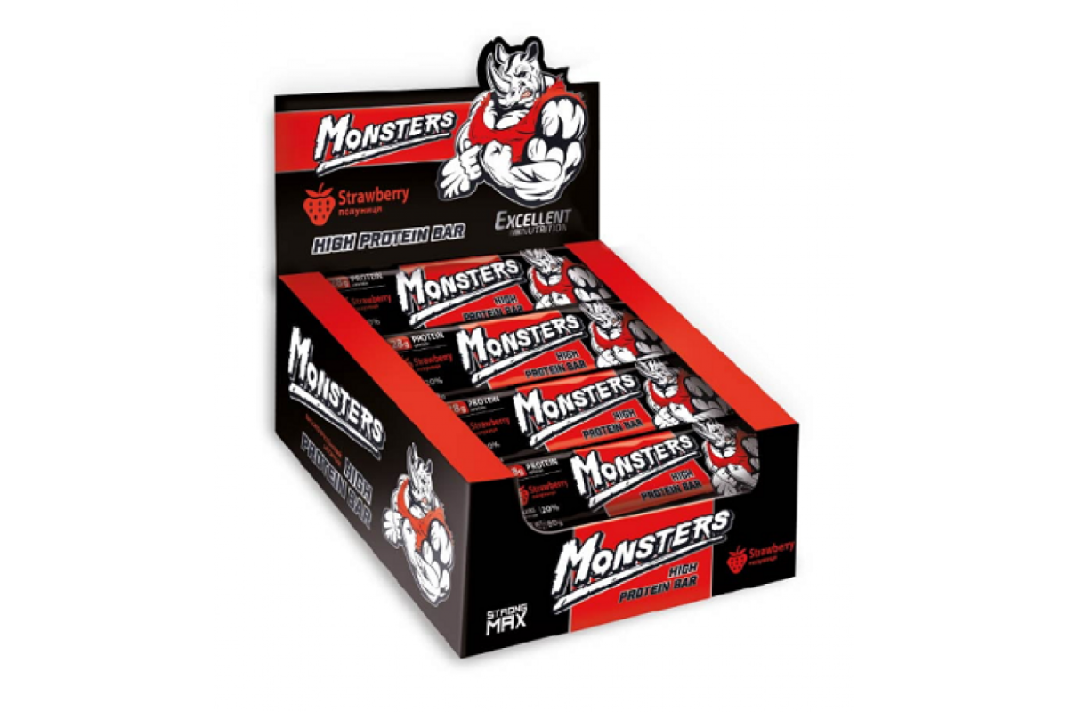 Найбільший та найкращий батончик в Україні. Цілих 28 грам високоякісного білка на 80 грам батончика. Як джерело білка використовується концентрат сироваткового білка, ізолят сироваткового білка та казеїн. Усього 21 грам вуглеводів. У складі ви не знайдете згущеного молока, мальтодекстрину та інших "не дієтичних" інгредієнтів, які так люблять використовувати багато виробників. Протеїнові батончики Monsters: зручний, швидкий та смачний спосіб отримати необхідну порцію справжнього білка та перекусити протягом дня. Поживна цінність 1 батончика (80 грам): Енергетична цінність: 274 кка Білки 28,6 г; жири 6,4 г; Вуглеводи 21 г. Склад: патока, концентрат сироваткового білка 22,63%, ізолят сироваткового білка 13,48%, фруктоза, казеїнат натрію, абрикос сушений (курага), глазур кондитерська (цукор білий кристалічний, жир рослинний, соєвий лецитин, ароматизатор "Какао", сіль кухонна)