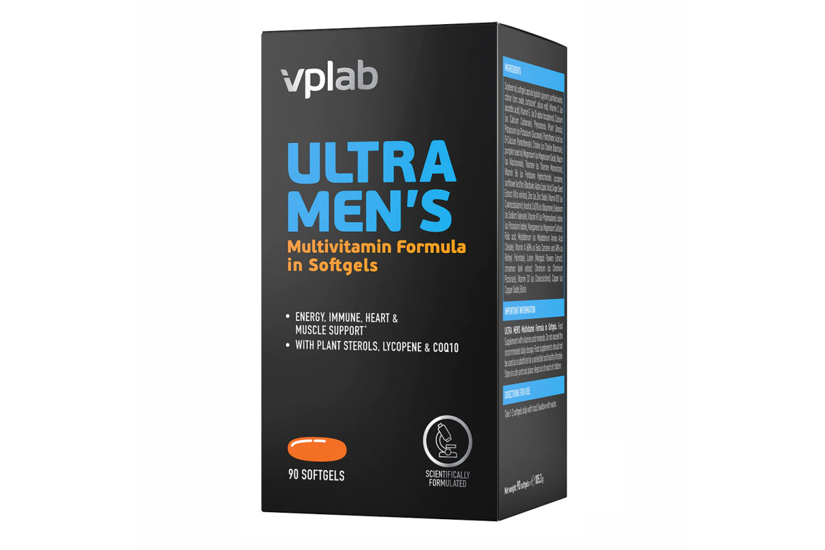 Унікальна мультивітамінна формула Vplab Ultra для чоловіків, що містить ключові поживні речовини, оптимізована для чоловічого здоров’я, працездатності та життєвої сили.