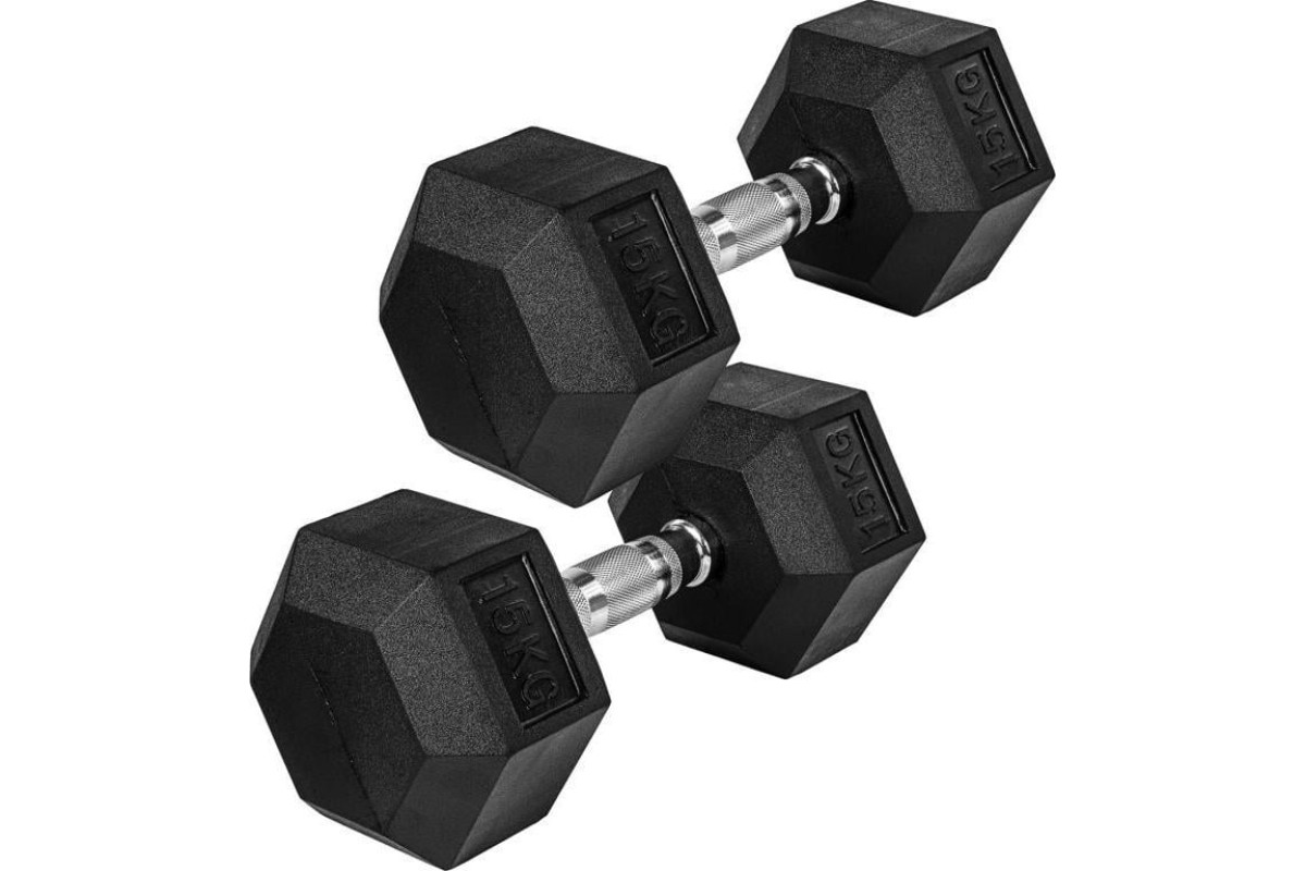 Шестигранні прогумовані гантелі мають хромовану сталеву ручку має хрестоподібні рифлені для надійного захоплення. Чавунний сердечник покритий спеціальною гумовою поверхнею, яка запобігає ковзанню гантелі.