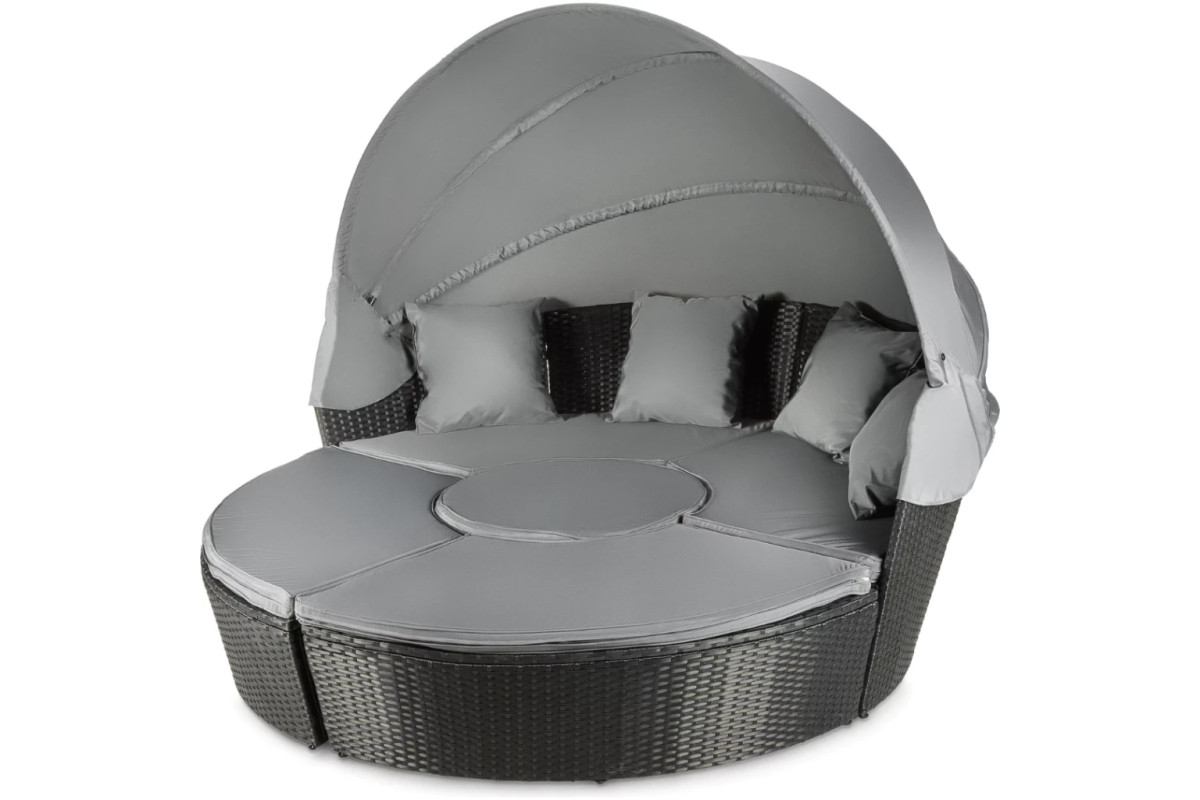 - Комплект садових меблів Round Lounge Chairs від бренду Outtec складається з п'яти незалежних модулів, що дає можливість використовувати набір в різних конфігураціях - це може бути, наприклад, кругле двоспальне ліжко, а також диван зі столиком і пуфами. Завдяки висувному навісу, Round Lounge Chairs забезпечує ефективний захист не тільки від сильного сонця, але і від вітру.
