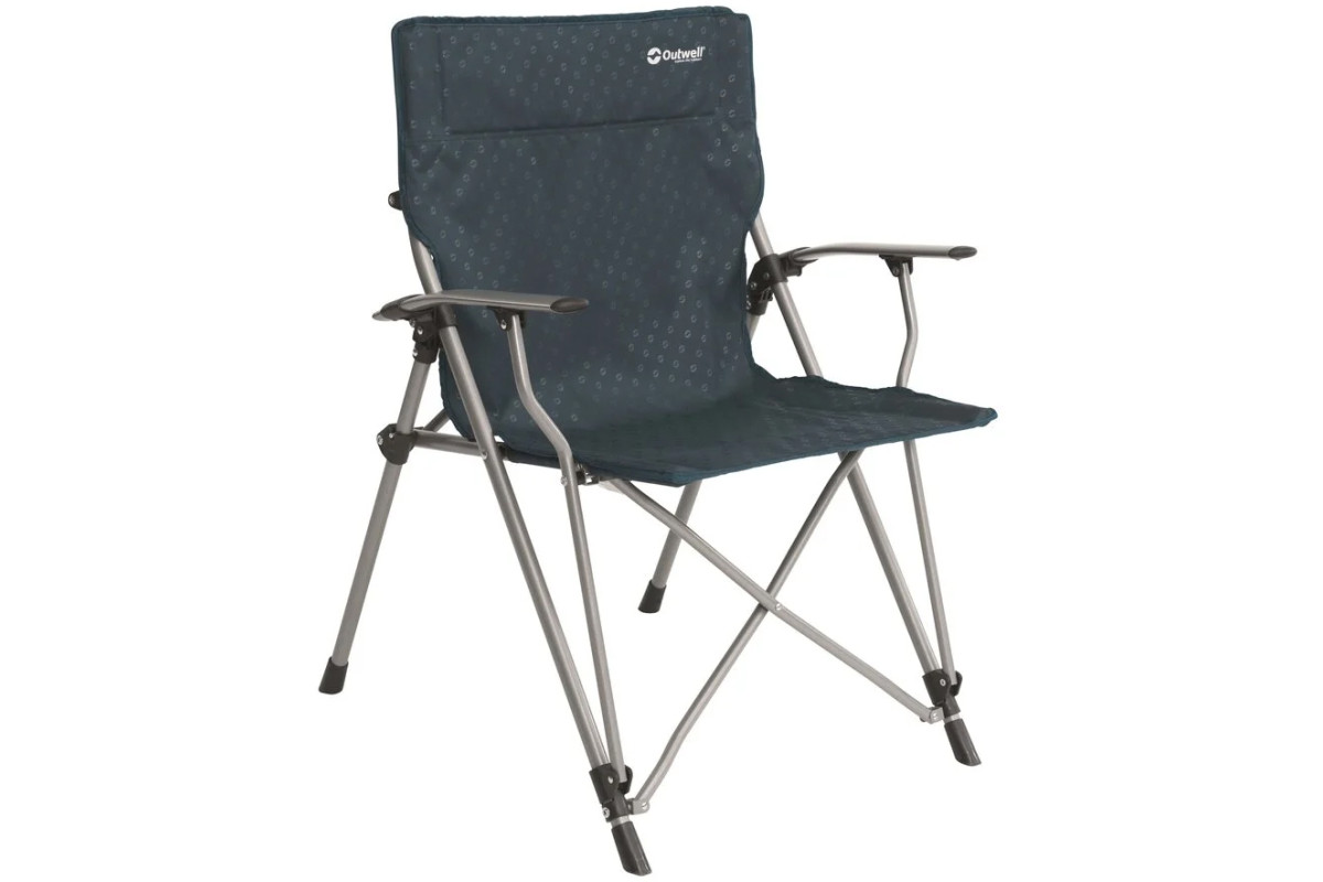 Outwell Goya Night Blue (470411) - розкладний стілець із широкими підлокітниками та міцним каркасом, виготовленим із високоміцної сталі з порошковим фарбуванням. Модель витримує навантаження до 125 кг та має чохол для перенесення, що полегшує транспортування та забезпечує компактне зберігання, коли стілець не використовується.