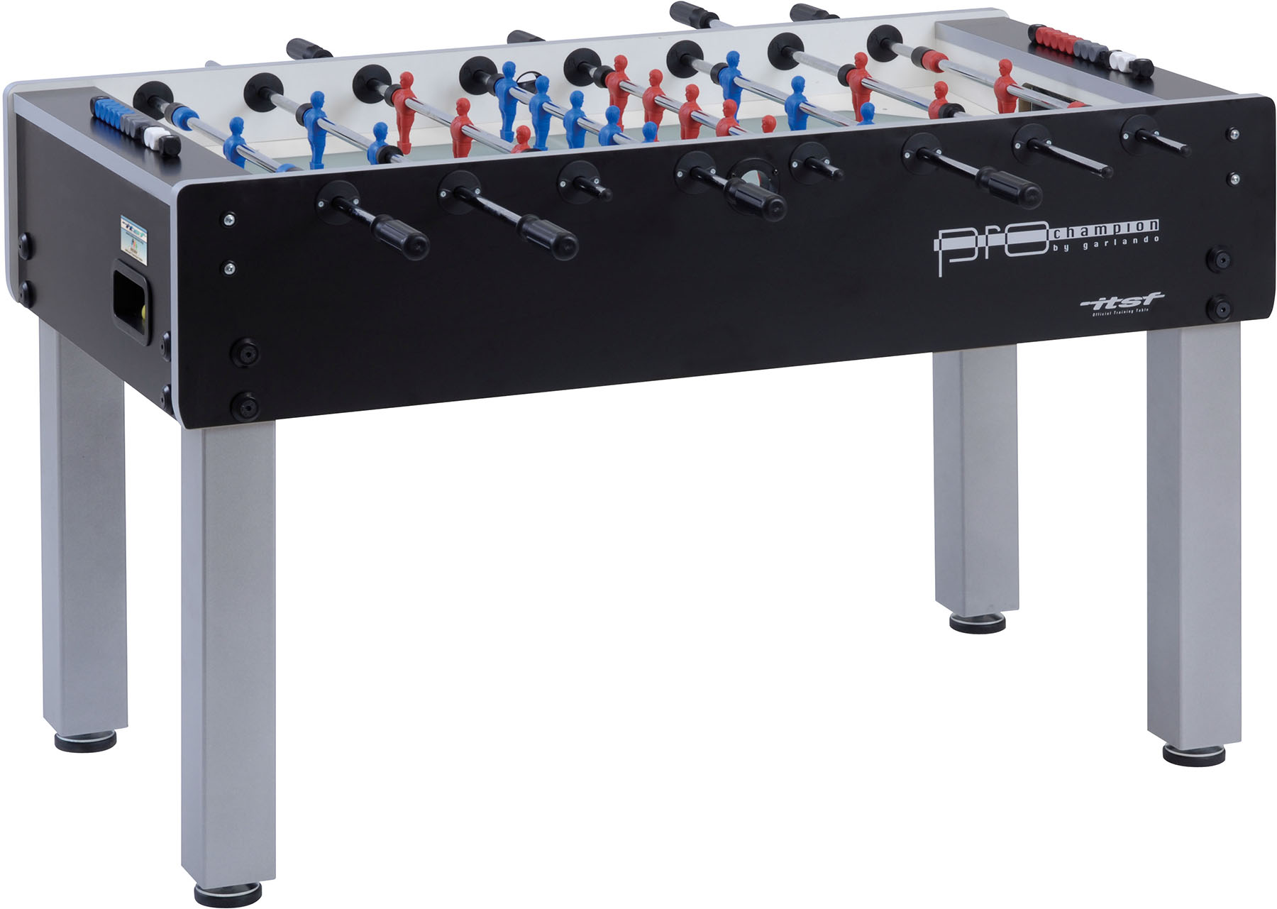 Настільний футбол Garlando Pro Champion ITSF (PRO) - офіційний стіл Міжнародної федерації настільного футболу ITSF, призначений для тренувань професійних гравців і змагань Pro Tour. Міцна конструкція стола має елегантне поєднання чорного та сріблястого кольорів, натхненного стилем хай-тек. Модель виготовлена безпосередньо в Італії з високоякісних матеріалів, що забезпечують довговічність і задоволення від гри, з урахуванням конкретних вимог, яким повинен відповідати футбольний стіл.