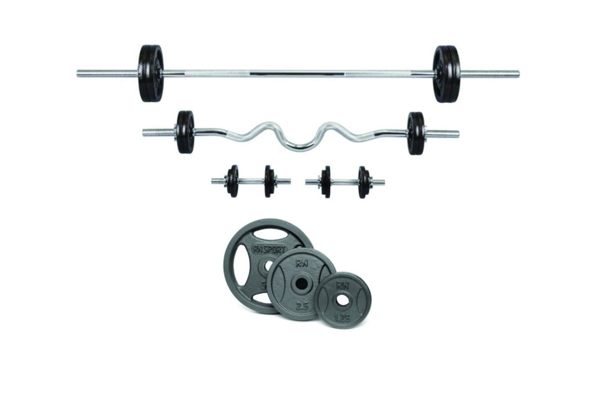 Набір металевих штанг та гантель Quatro-GRIP від RN-Sport. Диски виготовлені із металу. Після обробки диски розігрівають у печі до температури 180-200 градусів, фарбують удароміцною фарбою і знову запікають до формування міцної кірки. Завдяки дискам вагою 1.25 кг можна тренуватися з мінімальним кроком ваги. Зручності у використанні додає металеві хромовані грифи з насічкою проти ковзання рук та двома затискними гайками, які мають гумові втулки для щільної та надійної фіксації дисків. За допомогою хвата quatro диски 5 кг можна використовувати як окремий снаряд для різних вправ (підйоми диску для зміцнення плечей, обертання диску навколо корпусу для зміцнення м'язів живота (прес та косі м'язи), жим із-за голови для опрацювання трицепса, вправи для передплічь... ) Крім вправ, диски служать додатковою вагою для штанги та гантелей. Комплектація: Диск металевий 5 кг х 8шт. Диск металевий 2,5 кг х 8шт. Диск металевий 1,25 кг х 4шт. Гриф для штанги прямий, хромований 150 см, 2 затискні гайки Гриф хромований W-подібний 120 см, 2 затискні гайки Гриф гантельний, хромований 40 см 2 шт., гайки затискні 4 шт. Гарантія 5 років Розміри дисків кг: 1.25 кг – ф12 см, товщина 2 см; 2.5 кг - ф 16 см, товщина 2 см, 5 кг – ф22 см, товщина 3 см Діаметр навісної зони грифів 25 мм. Діаметр посадкового місця на дисках – 26,5 мм. Можна змінити комплектацію згідно Ваших побажань!