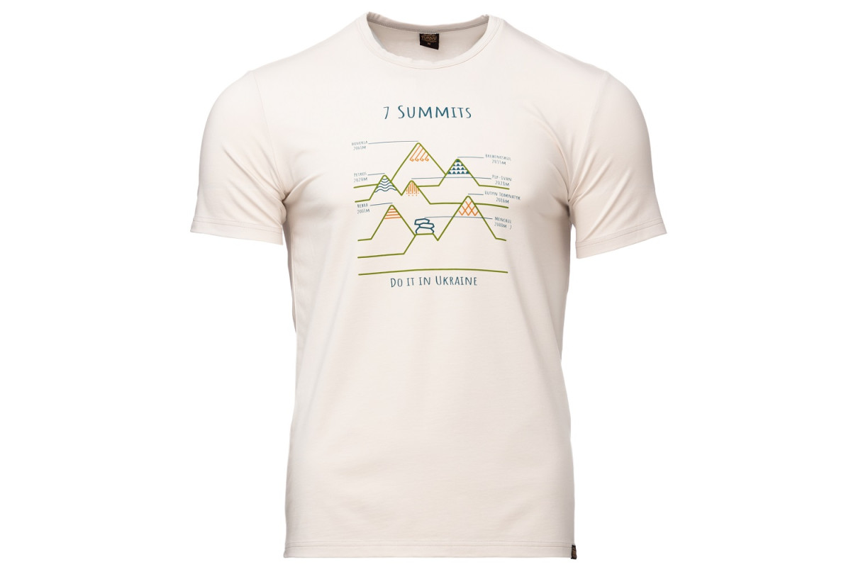 Turbat 7 Summits - яскрава чоловіча футболка, яка так і кличе у мандри. Зроблена з натуральної бавовни, виготовленої для Turbat в Литві. Вона дуже еластична, легка та приємна до тіла. Доповнена стильним дизайнерським принтом про сім найвищих вершин українських Карпат. Підійде як для подорожей, так і для повсякденного використання.