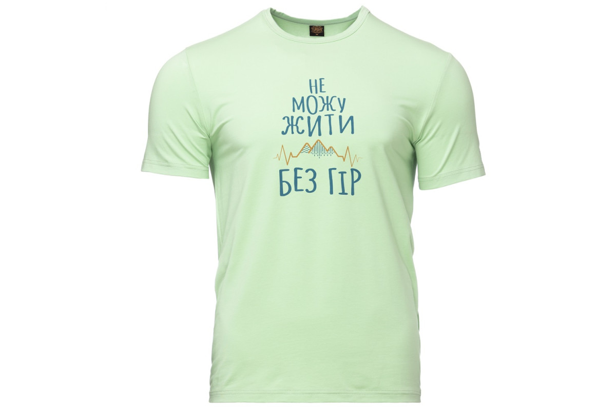 Оновлена чоловіча футболка, яка так і кличе у мандри. Модель Gory 3 із текстовим принтом ”Не можу жити без гір” зручна, приємна до тіла та на 95% складається з бавовни. Вона підійде як для подорожей, так і для повсякдення.