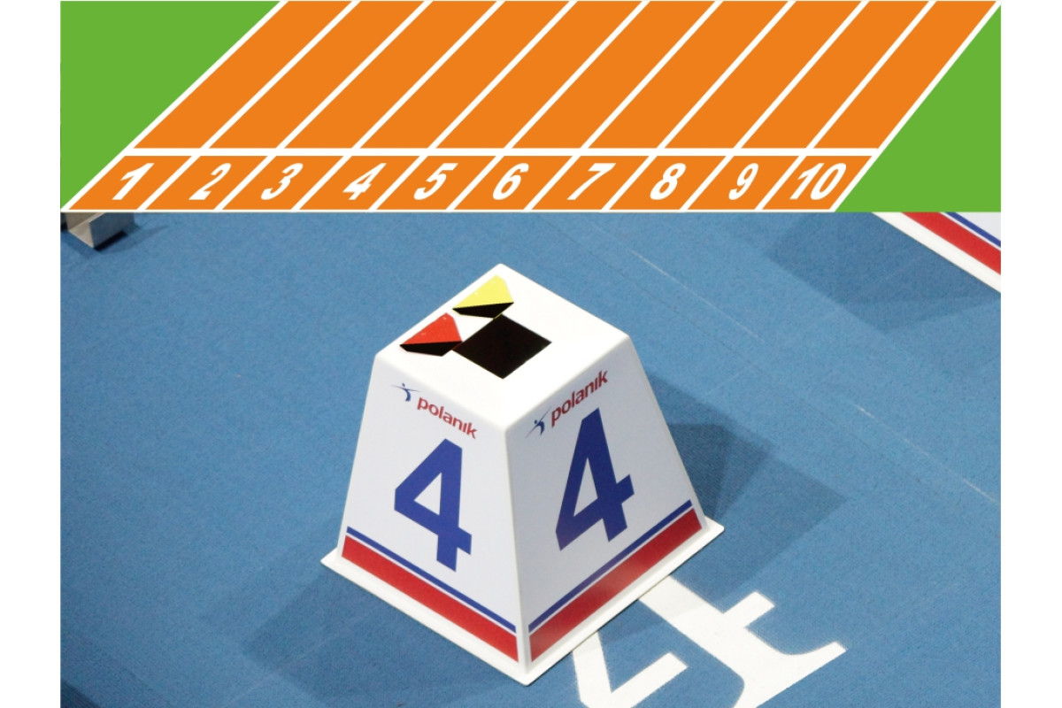 Набір з 10 міток LM-45, виготовлених зі скловолокна білого кольору, нового посиленого профілю, квадратного перетину, висотою 45 см, з темно-синіми цифрами з чотирьох сторін, оснащені індикаторами фальстарту