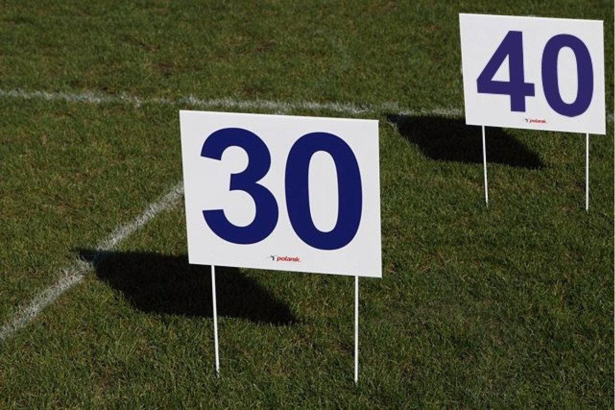 Набір з 14 маркерів, пофарбовані порошковою фарбою, цифри з обох боків, прямокутні з двома штифтами, призначені для метання на довгі дистанції (диск, молот і спис), дальність від 30 м до 90 м зі збільшенням на 10 м