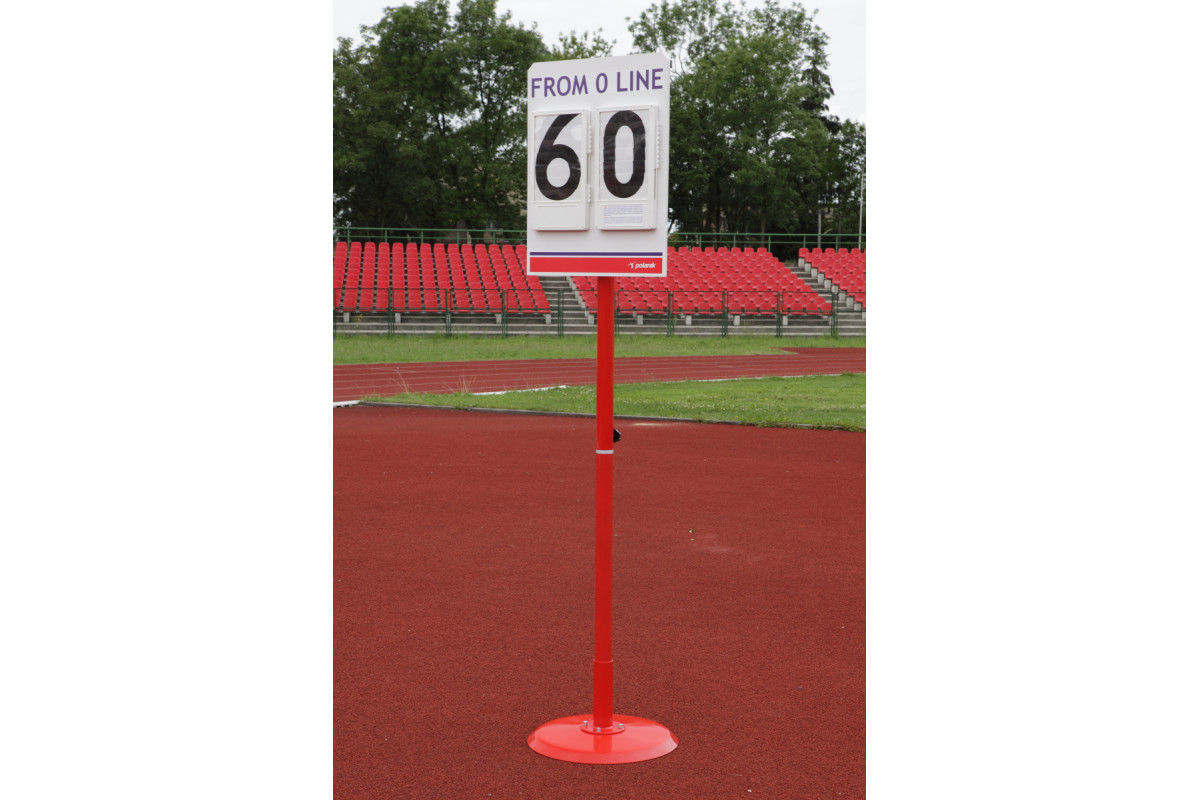 Показує фактичну відстань між стійкою для стрибків з жердиною та лінією "0", дві цифри, чітке розташування цифрових пластикових одиниць, плита зі спіненого ПВХ, прикручена до сталевої рами, двосегментна стійка з синтетичним з'єднувачем, обертається на 360°, блокується в потрібному положенні за допомогою маховика, стійка кругла основа, але досить легка, щоб її можна було переміщати