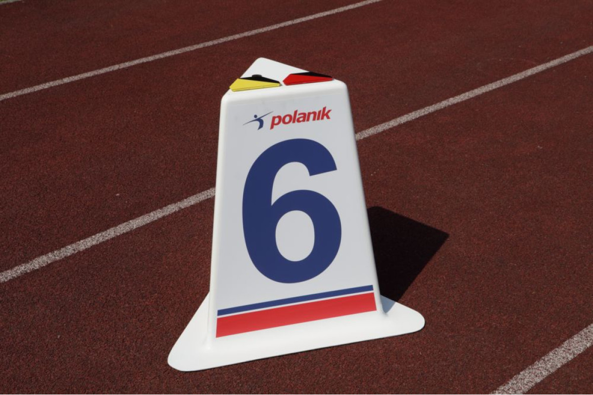виготовлені з білого скловолокна, трикутного перетину, висота 61 см з темно-синіми цифрами з трьох сторін, оснащені індикаторами фальстарту, при замовленні вкажіть номер доріжки, виготовлені з білого скловолокна, оснащені двома індикаторами фальстарту, спеціальна вирізана ручка, великі темно-сині цифри, забезпечують швидку ідентифікацію доріжки спортсмена, зручні для зберігання, доступні у вигляді готових наборів та окремо
