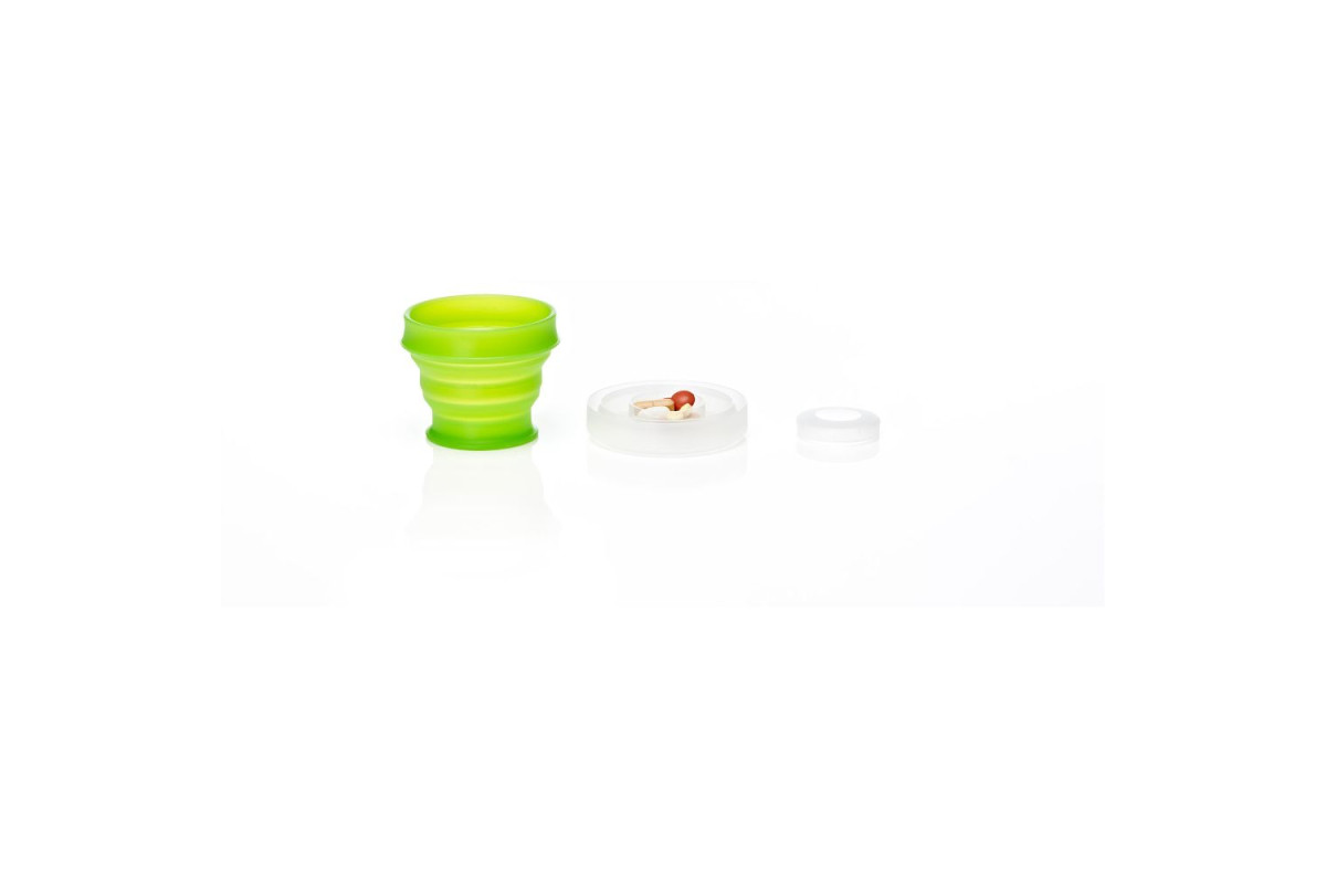 GoCup – дуже зручне складне горнятко для подорожей. Виготовлене із харчового силікону. Комплектується кришкою, завдяки чому ви можете бути впевненими, що рідина не розіллється із посудини при транспортуванні. Кришка має вбудований тримач для таблеток. У складеному стані горня займає мінімум місця. Матеріал виробу не містить шкідливих для людини й навколишнього середовища речовин. Розмір Small є найменшим із наявних у лінійці.