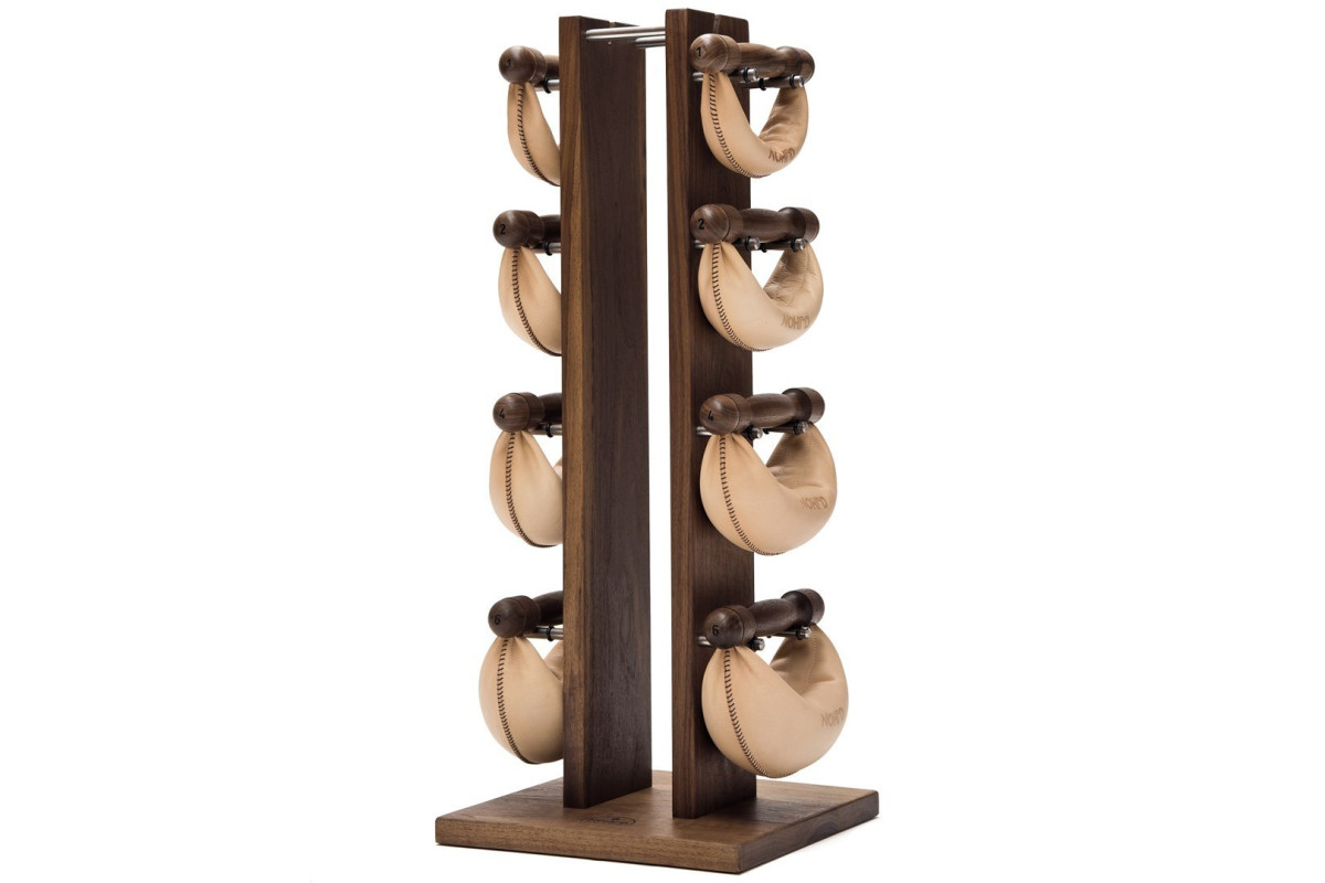 Стійка для гантелей SwingBell виготовлена з масиву горіха. 4 пари шкіряних гантелей підвішені на кронштейнах з високоякісної нержавіючої сталі. Ручки гантелей також виготовлені з масиву дерева. У верхній частині підставки є тримач для планшета або смартфона. Рукоятка також сумісна з тренувальною книгою, яка входить в комплект.