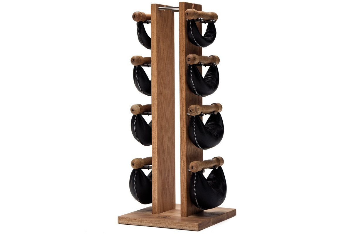 Стійка для гантелей SwingBell виготовлена з масиву дерева і вміщує вісім гантелей, повний комплект. У верхній частині стійки є тримач для планшета або смартфона - завдяки якому ви можете займатися, переглядаючи навчальні відео або поставити офіційний комплекс вправ під час тренування..