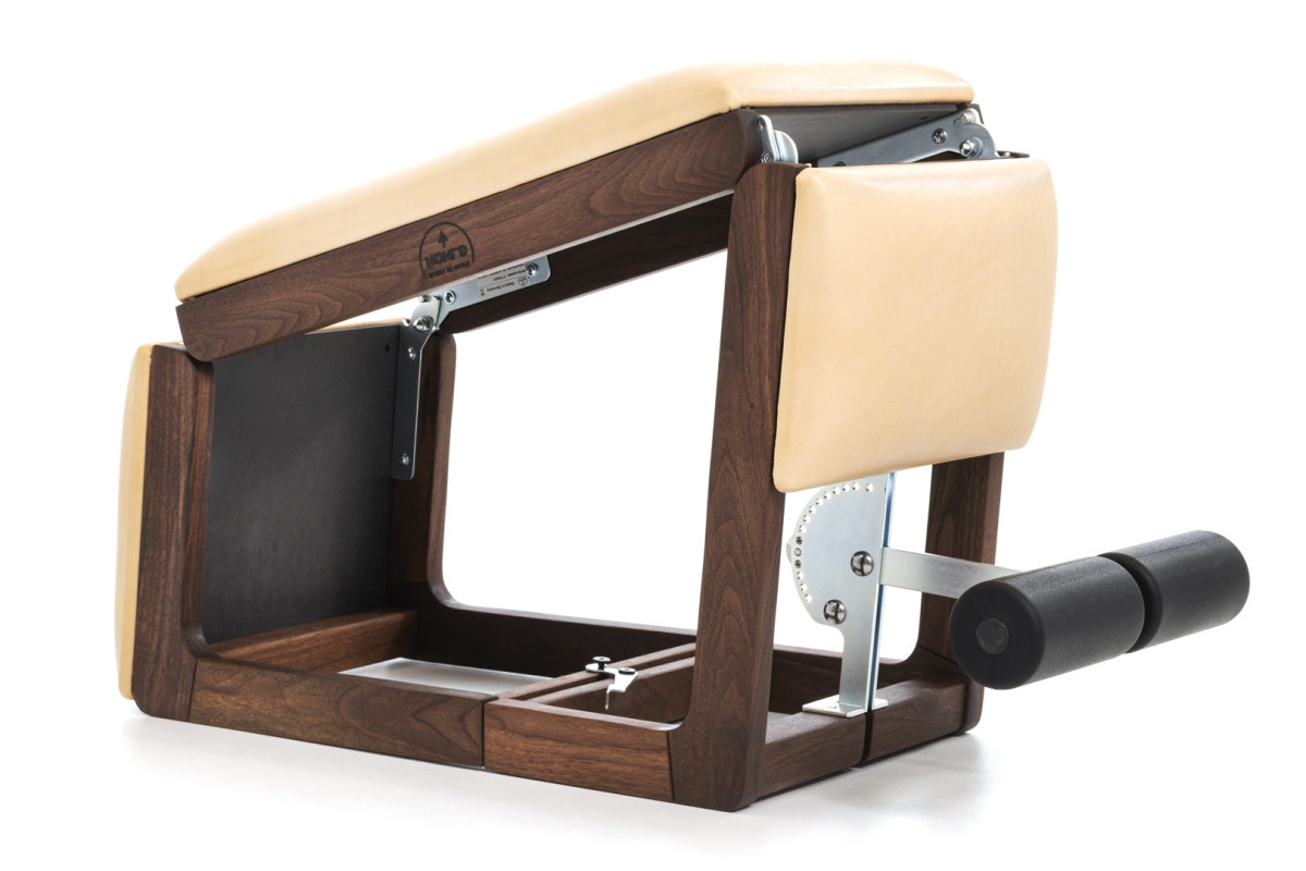Рама лавки виготовлена з вишневого дерева, в базовому положенні TriaTrainer займає менше одного квадратного метра площі. Гнучку підставку для ніг можна регулювати в десяти положеннях.