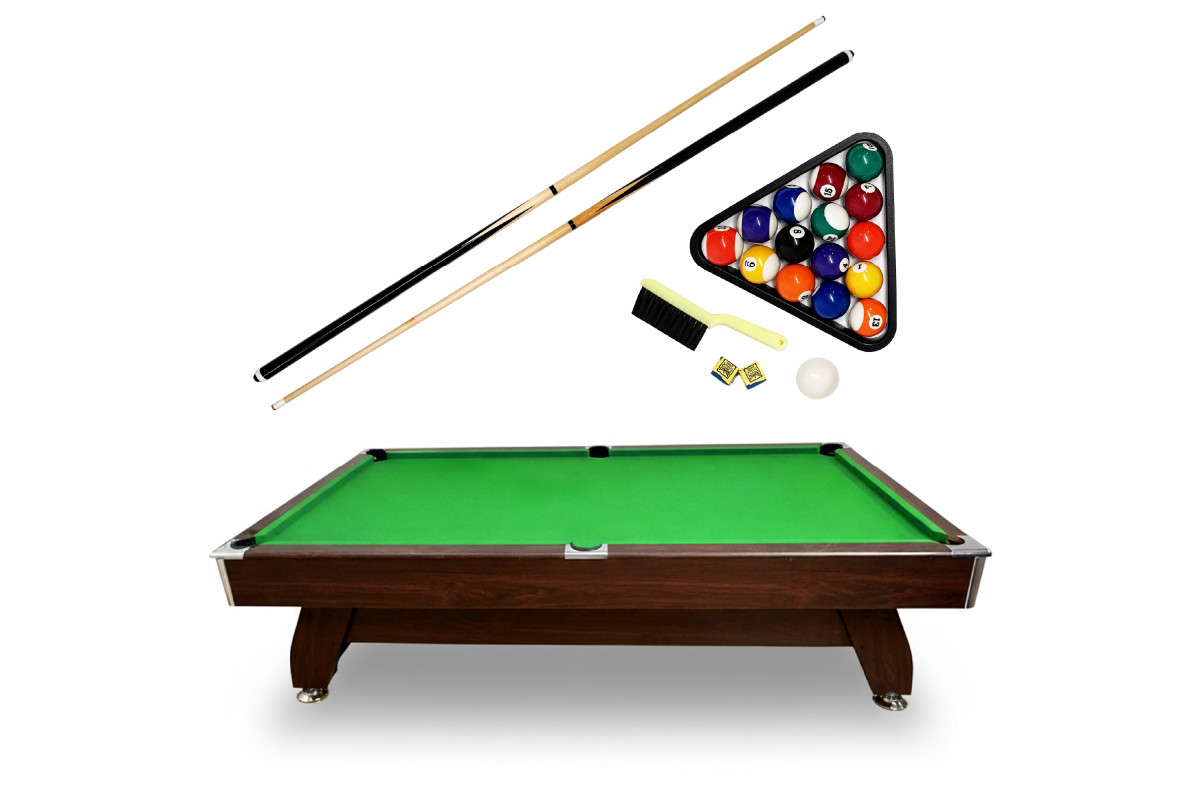 Більярдний стіл оснащений усім необхідним для гри – двома повнорозмірними складаними киями, набором кольорових куль з трикутником та двома крейдами для київ, а також щіткою для чищення сукна, що гарантує комфорт і реалістичність гри.