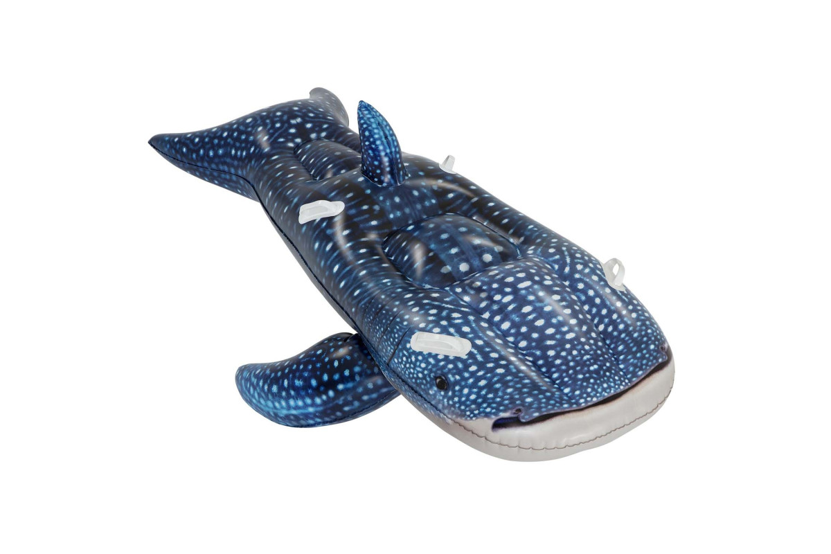 Надувна китова акула — це ідеальний варант, щоб розважити одразу двох маленьких бешкетників. Матрац має чотири міцні ручки, завдяки яким двоє дітей можуть легко плавати на киті. Або ж на ньому легко розміститься один дорослий вагою до 90 кг.