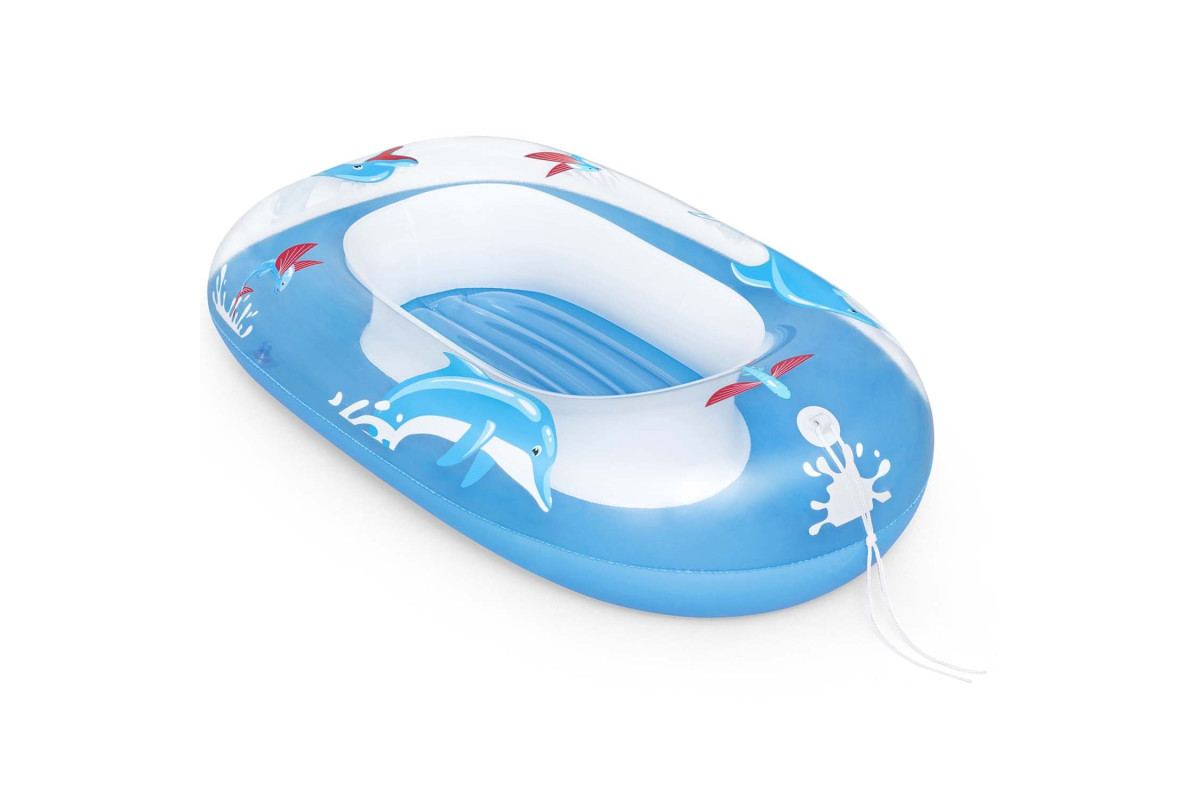 Дитячий понтон з дизайном дельфіна — ідеальне рішення для людей, які хочуть безпечно почати перший контакт своєї дитини з водою. Завдяки легкій конструкції надувний човен забезпечує безпеку і комфорт на воді. Ваша дитина зможе насолодитися комфортною їздою по воді або просто розслабитися. Понтон має надувну підлогу, яка забезпечить комфорт під час гри. Характерною особливістю човника є прикріплений спереду трос, що дає змогу маневрувати понтоном і підвищує комфорт використання. Пліт надувний ідеально підходить для моря або озера, а також для купання в басейні або ігор в саду.