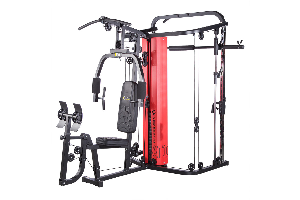 Тренажер ATOM від HMS - це комбінація мультитренажера з тренажером Сміта. Ця комбінація надає величезні можливості для тренувань і дозволяє користувачеві виконувати комплексне тренування всього тіла. Найякісніший матеріал Atom - це міцний пристрій, який буде добре працювати в будь-якому домашньому тренажерному залі. Точно виготовлені профілі з міцної сталі забезпечують стабільність і безпеку під час тренування. Міцна конструкція з увагою до кожної деталі дозволяє тренуватися двом людям одночасно. Комплексне тренування ATOM пропонує тренажер Сміта, два регульовані по висоті шківи, жим штанги, який легко трансформується в батерфляй, зону для ніг і перекладину для підтягування.