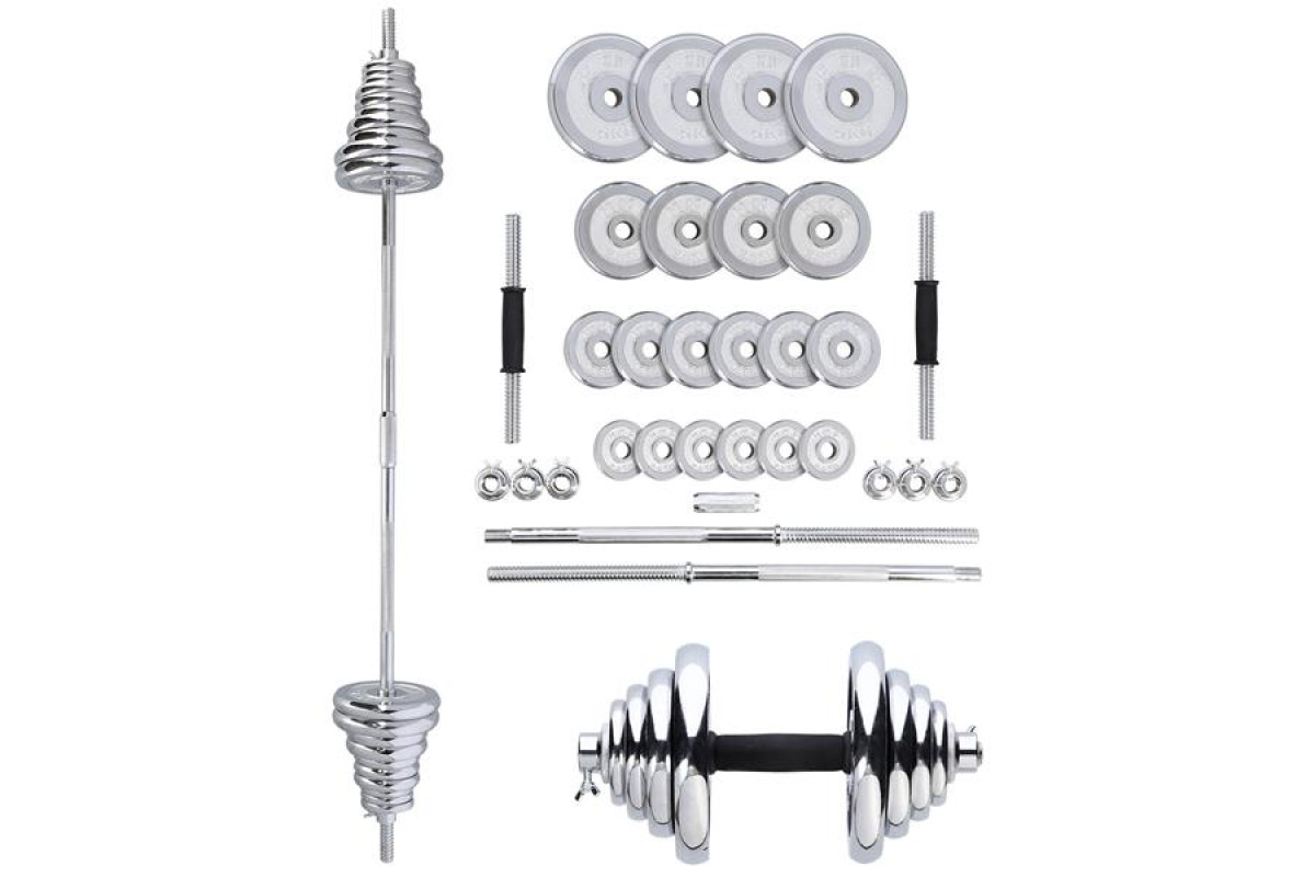 У комплект входять два коротких грифи, довгий гвинтовий гриф, шість затискачів і загалом 20 обтяжувальних дисків. Все це знаходиться в зручній валізі. Загальна вага комплекту становить 50 кг, тому для зручності транспортування валіза має колеса, що допомагає переміщатися з обладнанням.