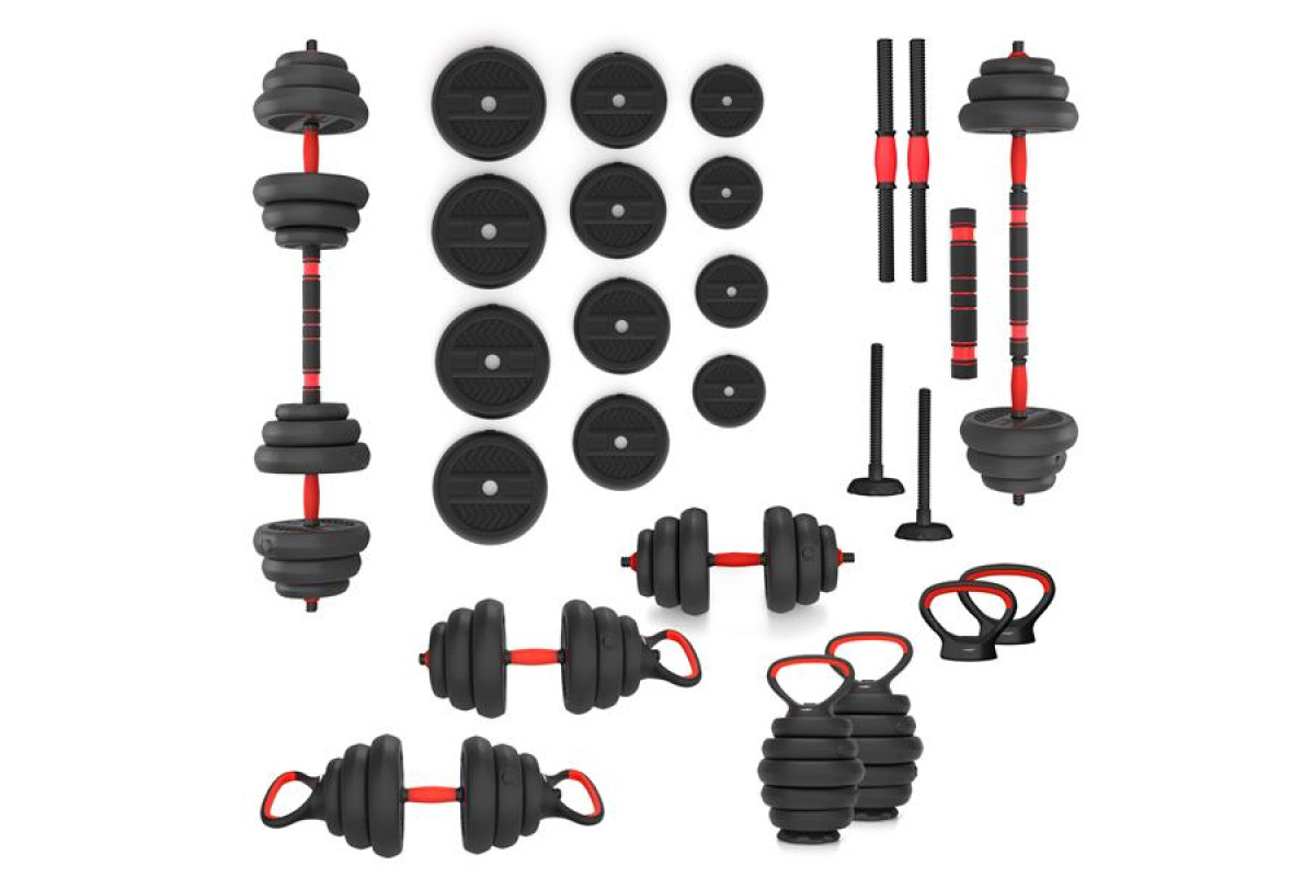 Дві гирі: покладіть пластини на підставку і прикрутіть ручку до гирі. Цей набір дозволяє тренуватися як з однією гирею, так і з двома. Гиря — це тип ваги, який використовується для виконання багатьох видів вправ, таких як балістичні вправи, що поєднують кардіо, силові вправи та вправи на гнучкість. Вправи з гирями також покращують серцево-судинну форму, координацію, стійкість і м'язову витривалість. Дві гантелі з подвійною ручкою: Ви можете прикрутити ручку з одного боку до гантелі. Тоді вийде щось на зразок гирі, але її незвичайна форма дозволяє виконувати спеціальні вправи. Таке рішення полегшить виконання французького жиму або присідання зі штангою.