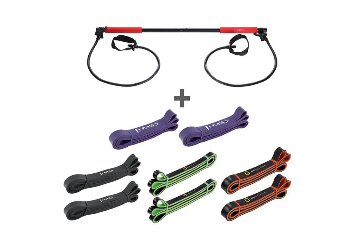 Представляємо набір, який поєднує в собі штангу DC30 та резинові стрічки. Ця комбінація дає багато можливостей для тренувань. Штанга має дві смуги опору та прикріплені терабанди. Резинки, прикріплені до штанги, виконують функцію обважнювачів. Однак у них є перевага, якої немає у пластин, а саме - вони дають нерівномірне навантаження. Навантаження збільшується в міру розтягування стрічки, тому в більшості вправ максимальне навантаження досягається в момент найбільшого напруження м'язів. Завдяки гумкам з різним діапазоном навантаження, вагу можна підлаштувати під конкретну вправу. Резинки можна використовувати подвійні або одинарні.