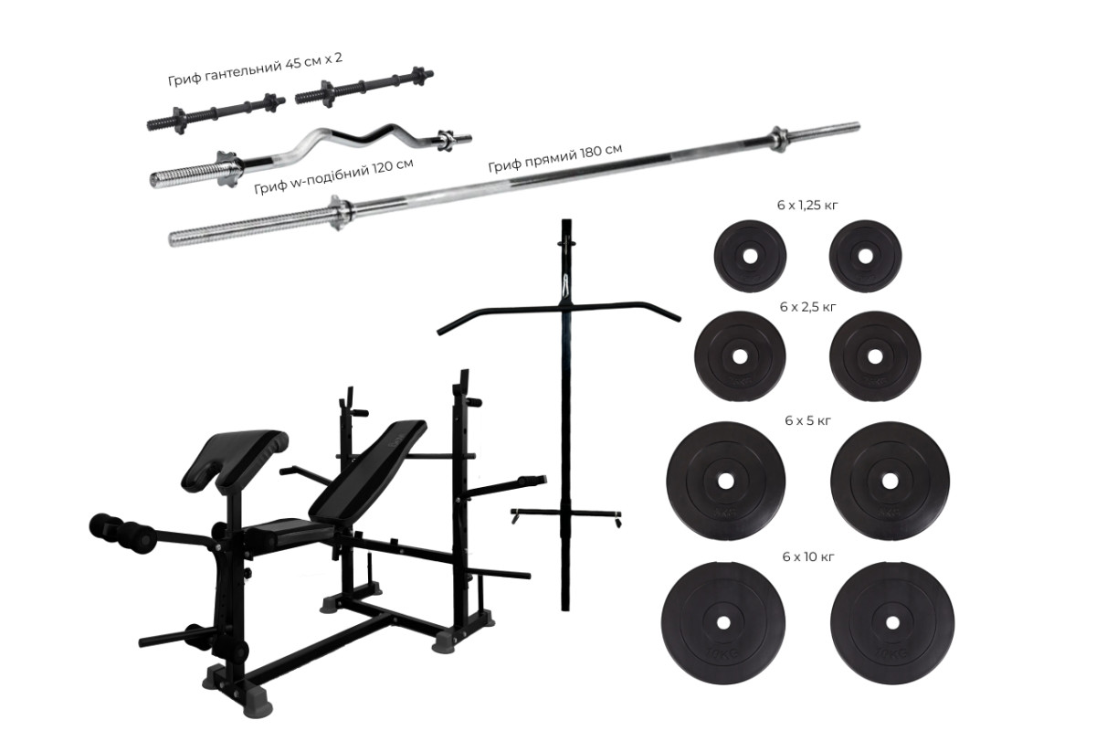 Для виконання силових вправ у комплект входить тяга зверху. Як навантаження використовуються вагові диски з посадковим діаметром 25 мм і 31 мм.