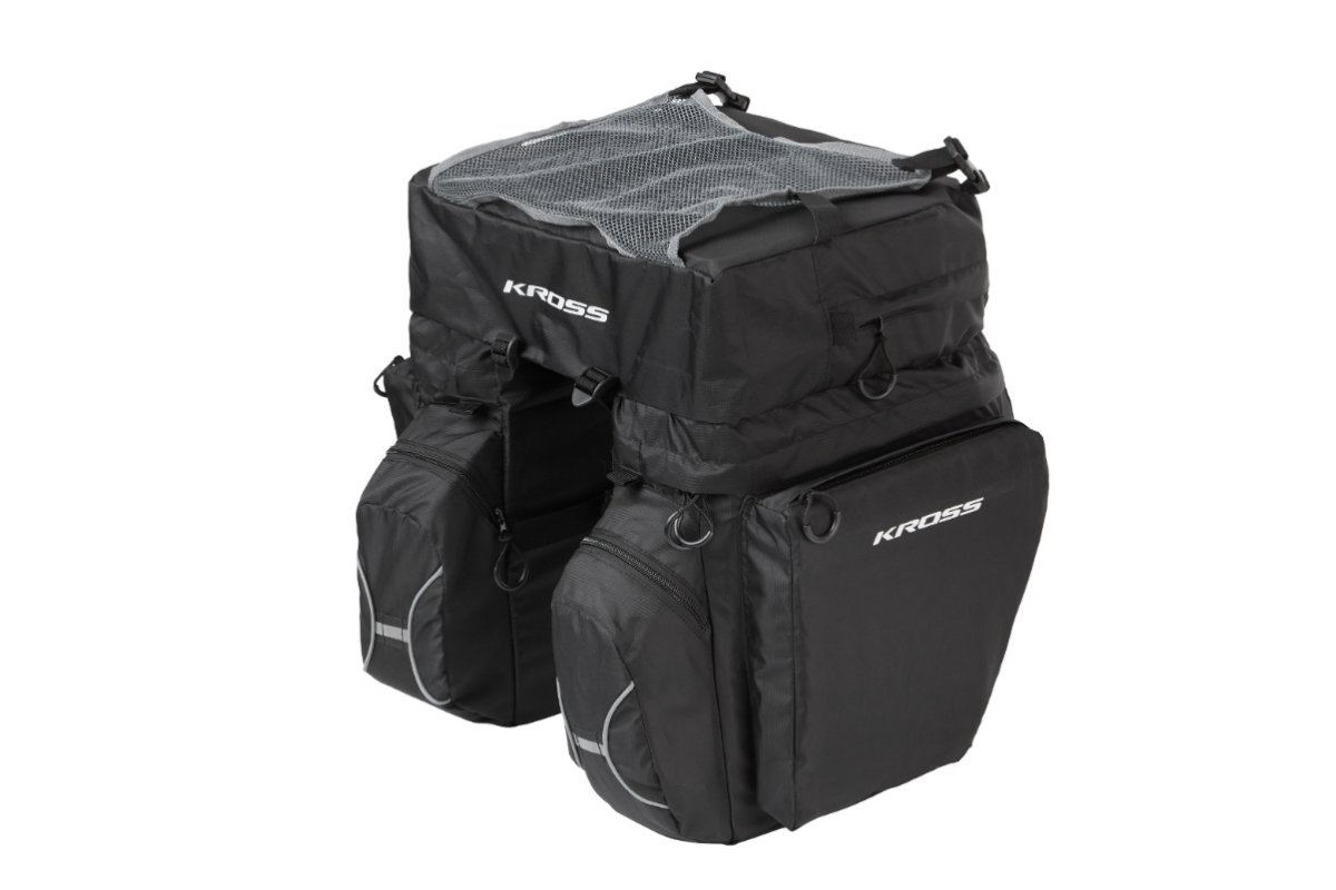 Triple Rear Rack Bag Kross Roamer - це першокласна потрійна сумка на задньому багажнику, виготовлена з міцного поліестеру. Оскільки внутрішня частина відділень посилена, сумка зберігає свою форму. У невеликі бічні кишені можна вмістити невеликі речі. Зверху є сітка, до якої можна прикріпити сумку більшого розміру. Сумка легко кріпиться до стійки (інструменти не потрібні). Сумка дозволяє взяти з собою все, що може знадобитися у подорожі – гаманець, ключі, телефон, закуски та навіть запасний одяг.