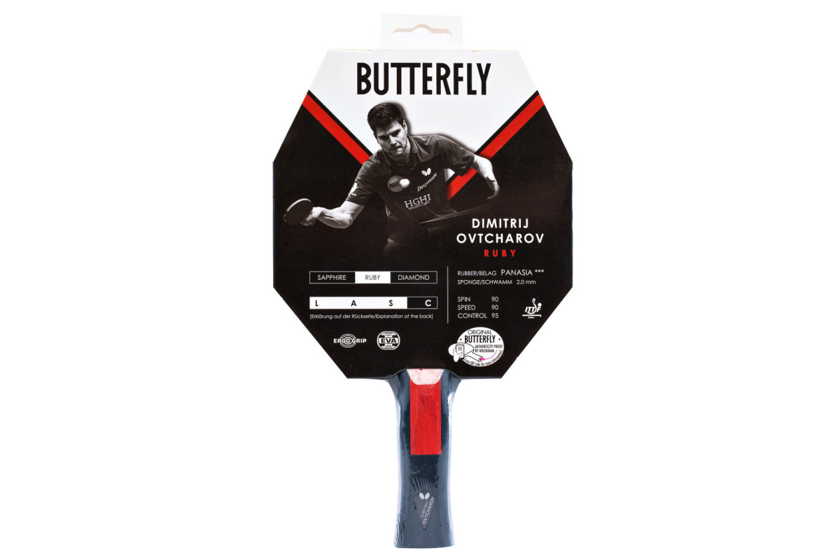 BUTTERFLY DIMITRIJ OVTCHAROV RUBY - це ракетка, призначена для технічно просунутих гравців. Схвалена ITTF гума Pan Asia з губкою 1,8 мм, технологією Ergo Grip та інноваційним шаром EVA забезпечують швидку та ротаційну гру в нападі та захисті.