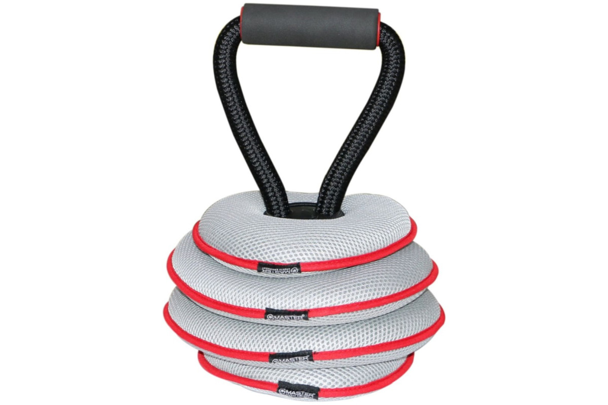 Регульована гантель MASTER Soft-Bell відрізняється від звичайних гантелей можливістю змінювати вагу від 0,5 до 9,5 кг. Вона має трикутну ручку та пластиковий корпус, на який можна прикріпити до чотирьох обважнювачів. Гантель наповнена піском і обтягнута тканиною, що робить її безпечною для використання вдома. Вам не потрібно хвилюватися, що можете пошкодити підлогу чи меблі, як у випадку з класичною гантеллю. Перевагою м’якого матеріалу є також те, що ви не можете травмуватися при випадковому ударі, як це буває зі стандартною штангою.