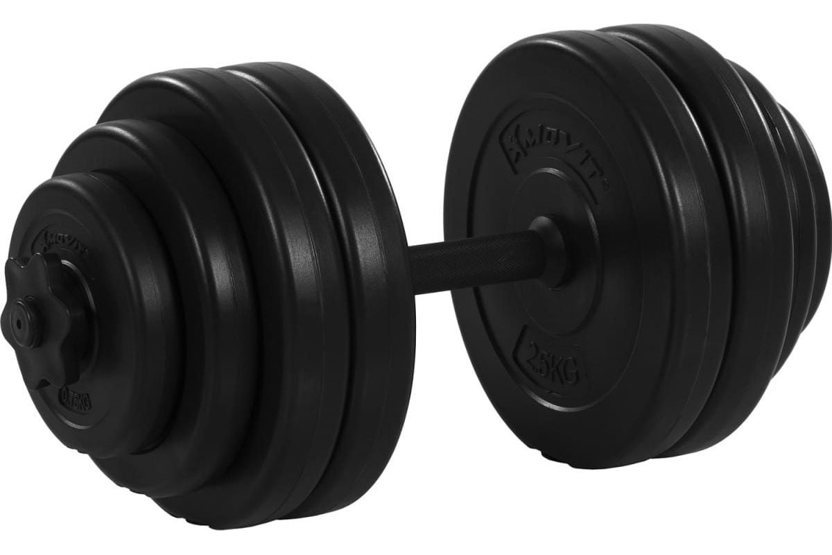 З набором гантелей MOVIT® ви не тільки попрацюєте над своєю фігурою, але і зміцните м'язи та силу тіла. Завдяки їм ви будете підготовлені до різних видів фізичних навантажень. Рифлення штанги гарантує, що вона не вислизне з рук під час тренування. Затискачі у формі зірки гарантують, що гирі завжди міцно та надійно прикріплені до штанги.
