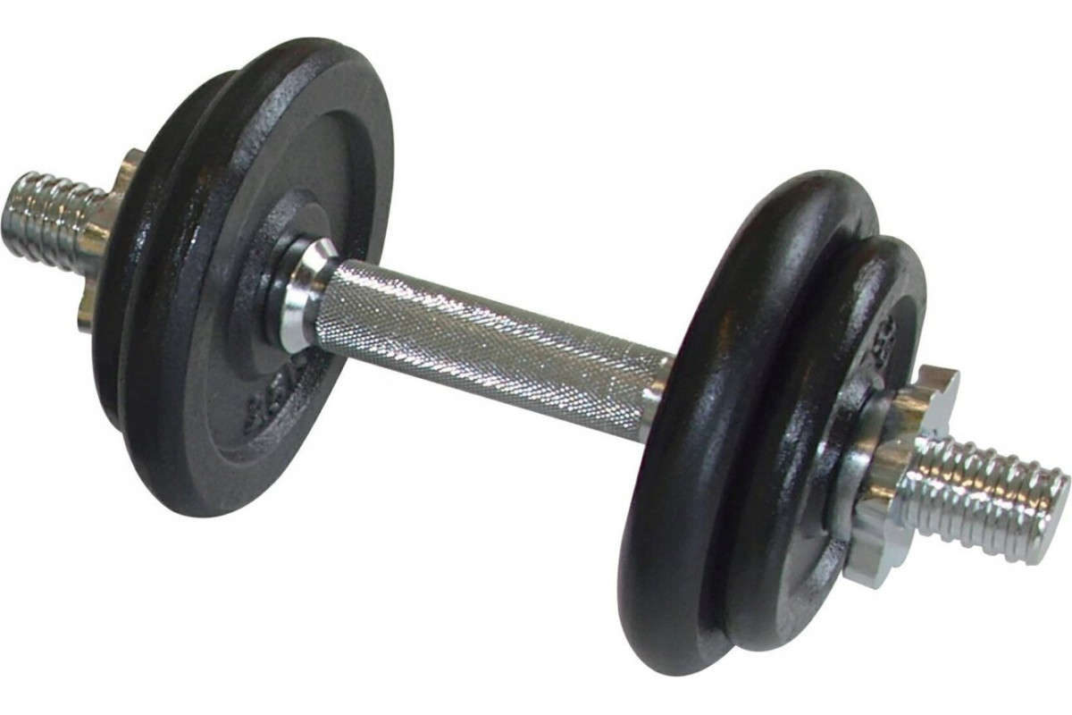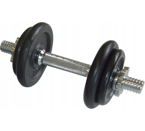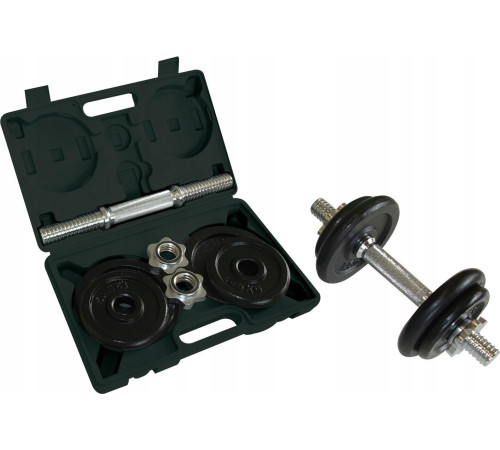 Якісний набір гантелей від відомої фітнес-компанії Schildkröt, короткий набір гантелей вагою 10 кг складається з литих, чорних, чавунних пластин - 2 х 2,50 кг, 2 х 1,25 кг, короткого сталевого прутка (30 см) з хромованими наконечниками з різьбленням і запобіжними гайками у формі зірки з гумовими кільцями.