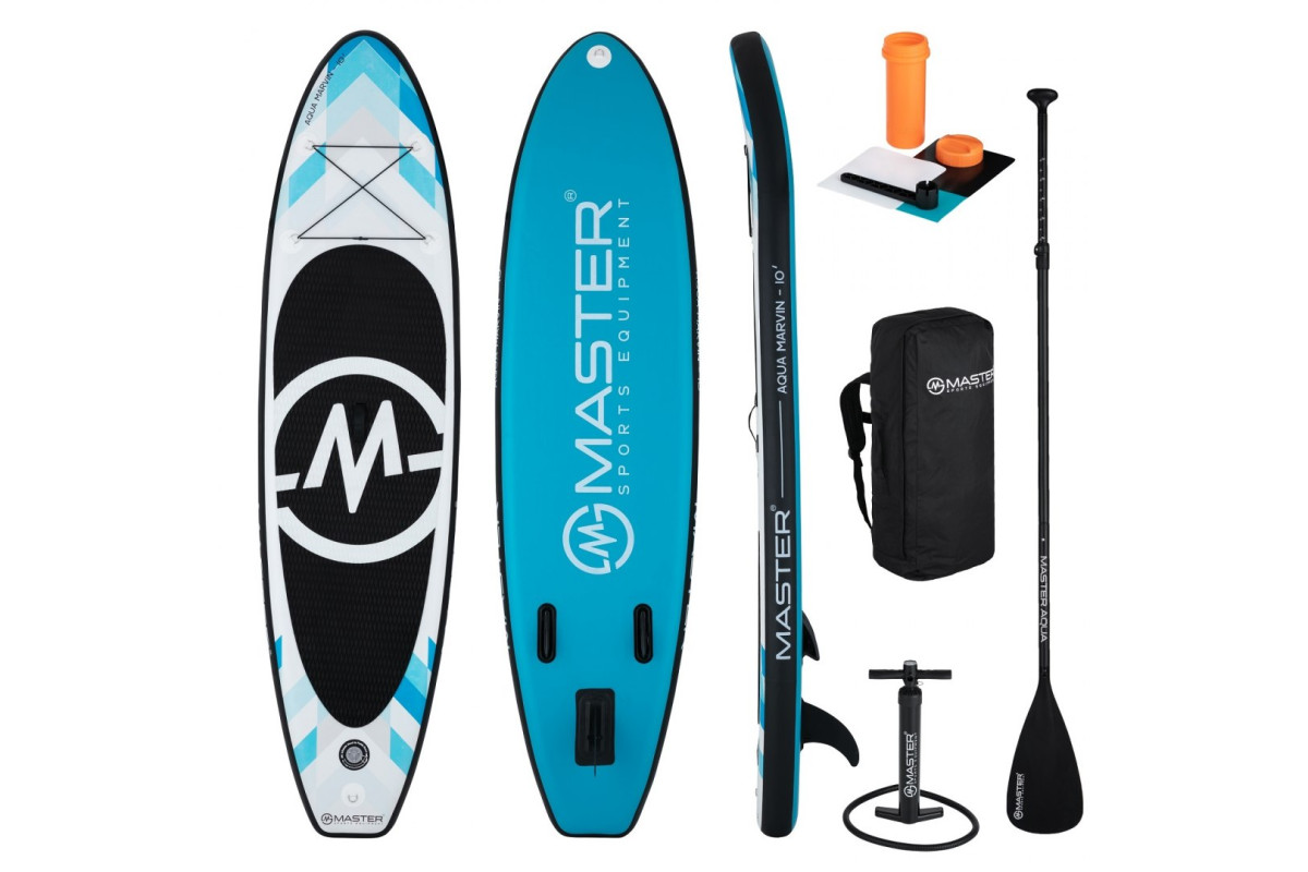 Надувна SUP дошка MASTER Aqua Marvin 300 призначена для початківців і досвідчених плавців, які хочуть насолоджуватися спокійним водним відпочинком та легкими хвилями. Це чудовий вибір з відмінним співвідношенням ціни та якості для тих, хто хоче насолоджуватися веслуванням. Виготовлена з матеріалу DROP STITCH, дошка має конструкцію, яка підходить для всіх вікових груп і виготовлена з матеріалів, стійких до солоної води та UV-випромінювання, легко надувається, спускається та упакована в зручну сумку.