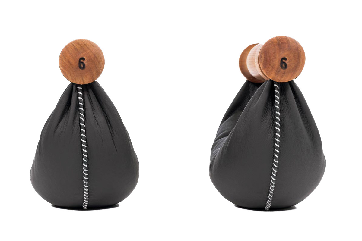 Dumbbells made of solid wood and hand-stitched genuine leather.