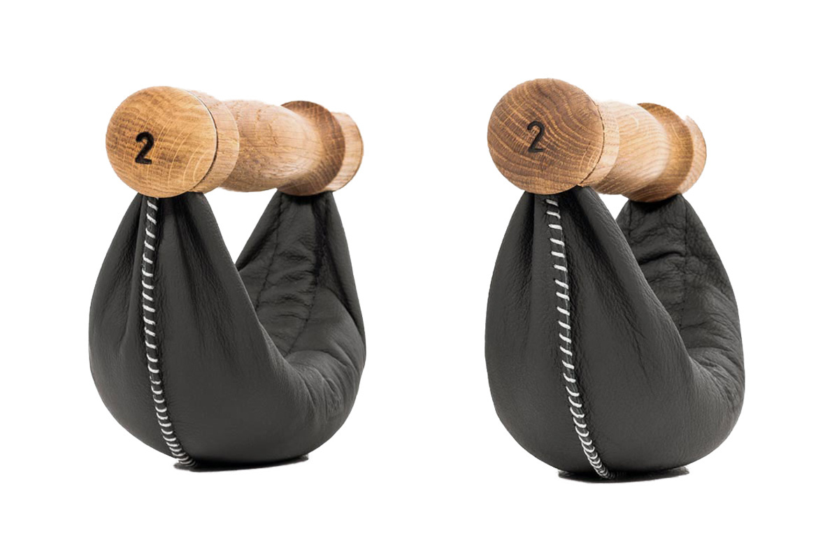Гантелі з масиву дерева і зшитої вручну натуральної шкіри.