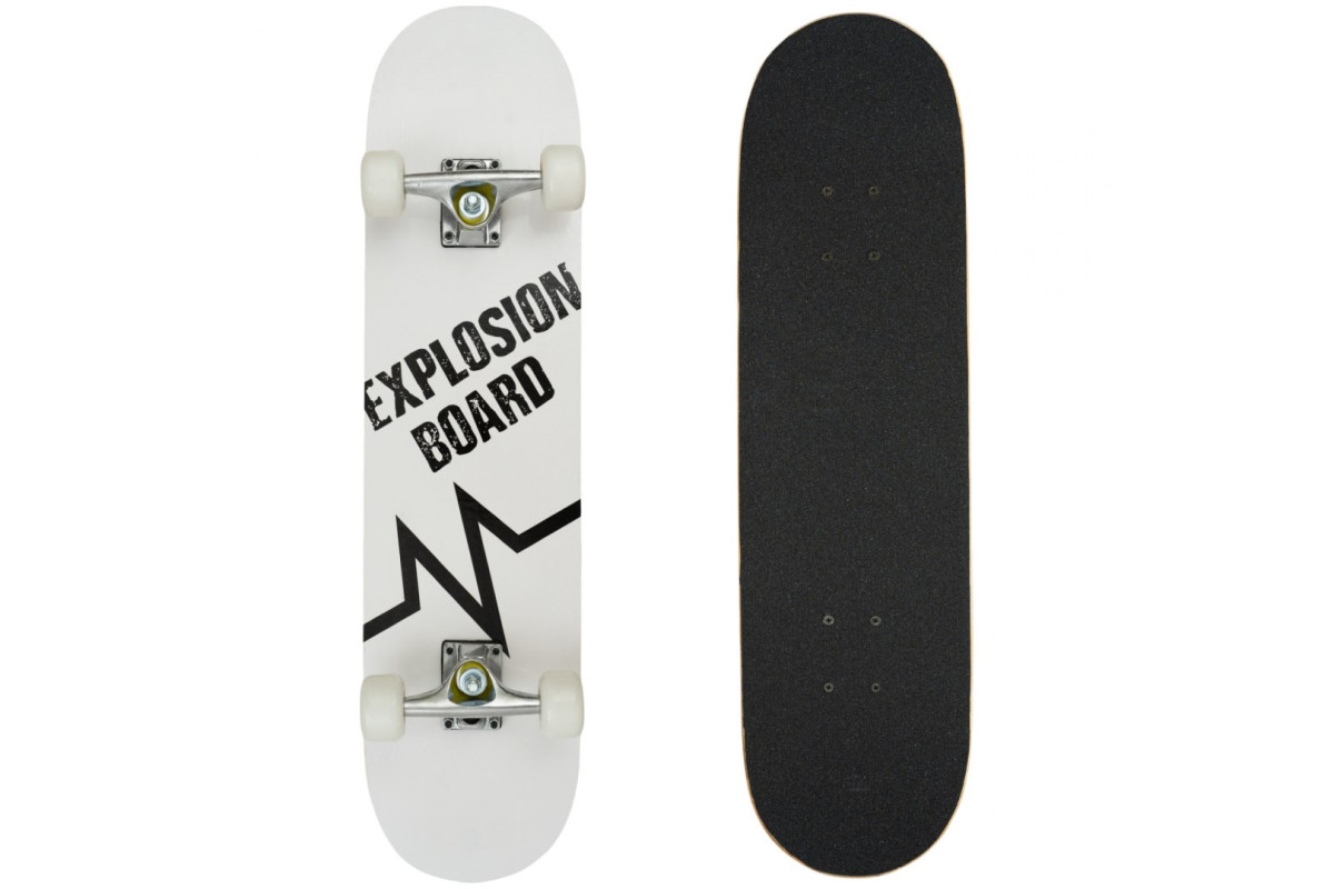 Молодіжний скейтборд MASTER Explosion Board - чорно-білий - чудовий вибір як для початківців, так і для досвідчених скейтбордистів. Міцна та надійна 9-шарова конструкція має невелику вагу і чудово підходить для навчання та розважального катання. Поліуретанові колеса на підшипниках ABEC7 забезпечать швидке та плавне катання. Модний та молодіжний дизайн неодмінно задовольнить найвибагливіші смаки.