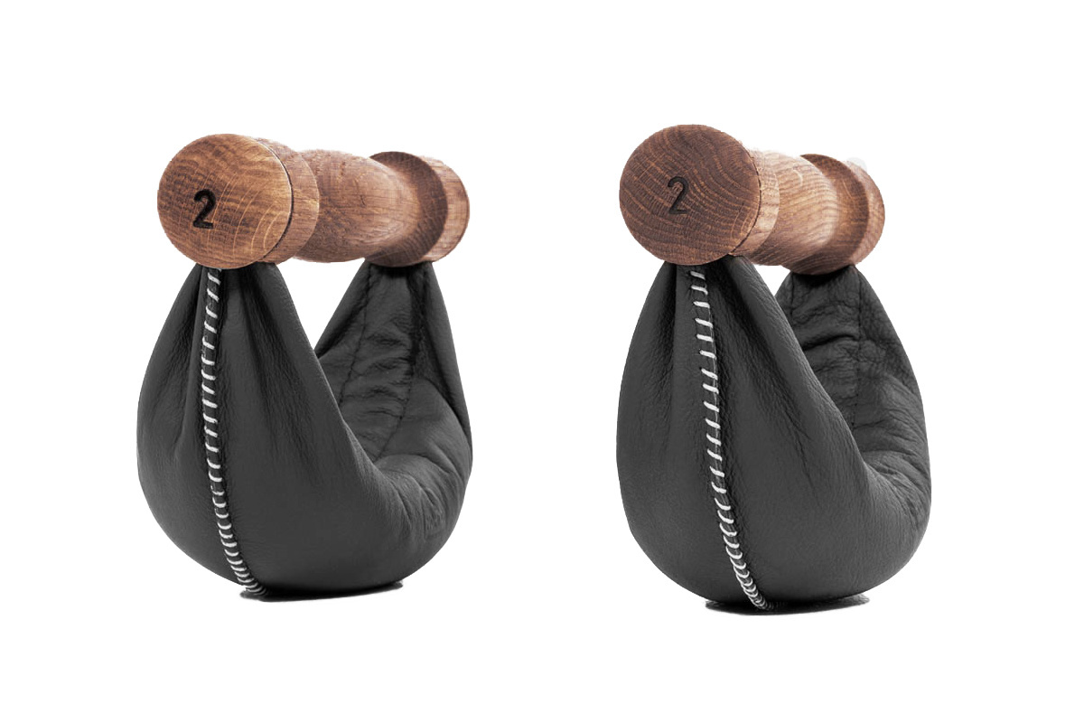Гантелі з масиву дерева і зшитої вручну натуральної шкіри.