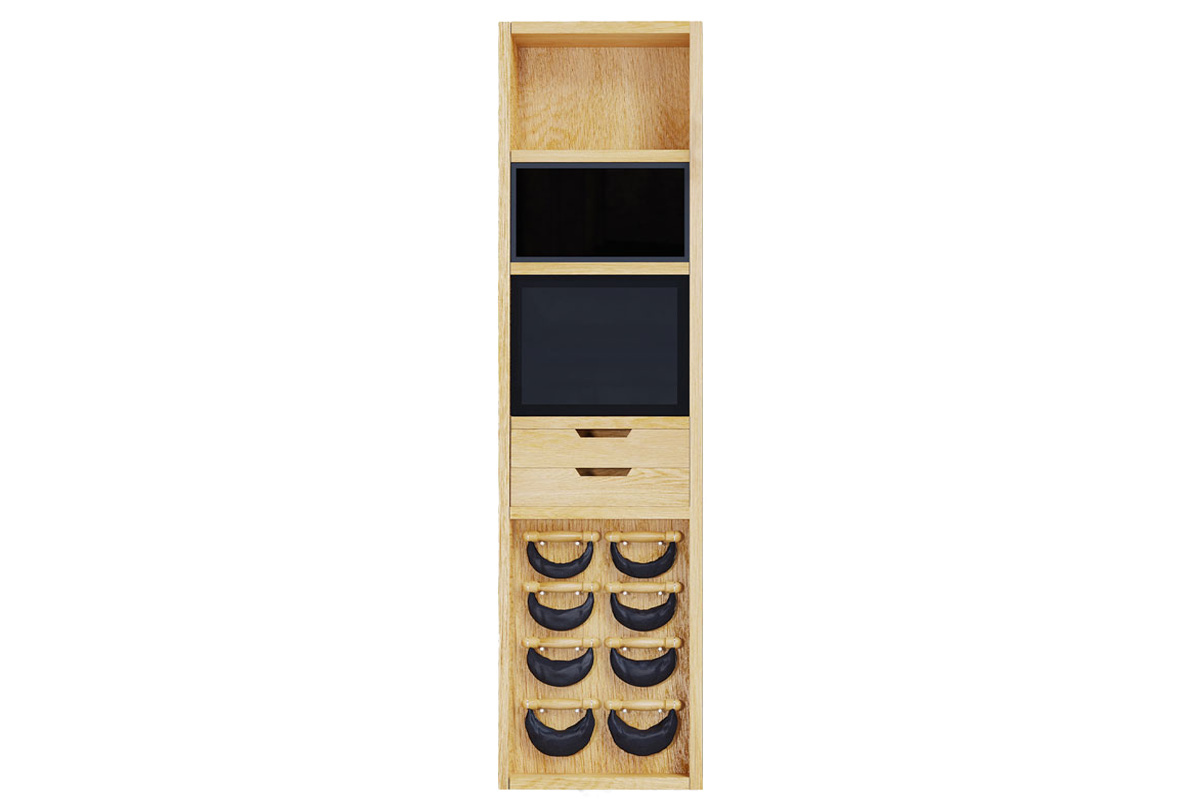Основний блок оснащений вбудованим 22-дюймовим сенсорним екраном, який пропонує широкий вибір попередньо налаштованих тренувань. У нижньому блоці розміщений повний набір вільних ваг NOHRD SwingBells для універсальності в силових тренуваннях. Простір, що залишився, можна використати для додаткового міні-бару, холодильника або висувних ящиків, додаючи функціональності та індивідуальності пристрою. Для того, щоб агрегат функціонував належним чином, необхідно мати доступ до розетки 220В - кабель підключається до задньої частини блоку. Кожен блок також оснащений декоративними панелями, які надають пристрою професійний та естетично привабливий вигляд. Це гарантує, що блок не тільки виконує свою тренувальну функцію, але й елегантно виглядає в будь-якому інтер'єрі, створюючи гармонійний простір для тренувань.
