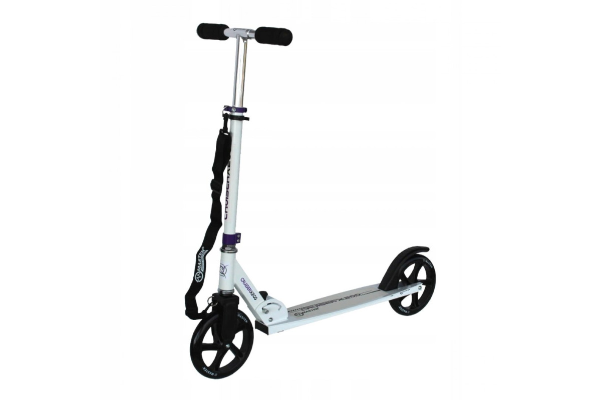 Складний самокат MASTER Cruiser з підніжкою та ременем для транспортування має регульовану по висоті ручку. Самокат складається, тому його зручно транспортувати і він займає мало місця при зберіганні. Накладки на кермо виготовлені з м'якої піни, що забезпечує надійне зчеплення і не викликає натирання або пітливості рук, що підвищує комфорт і безпеку їзди. Задній бризговик виконує функцію гальма.