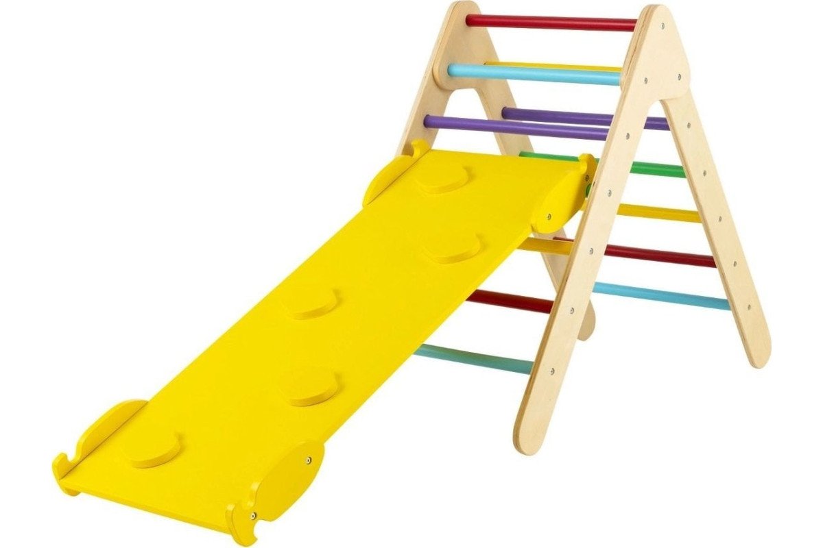 Трикутний набір для скелелазіння 3-в-1: ігровий набір складається зі стійкої трикутної рами та двостороннього пандуса, який одночасно є гіркою та додатковою стінкою для скелелазіння. Регульована рампа: батьки можуть регулювати кут нахилу стіни відповідно до віку дітей, щоб запропонувати різні рівні складності.
