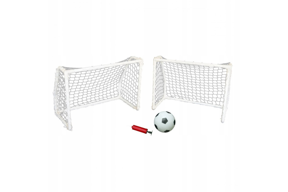 У комплект входять дві ворота з поліетиленовими сітками, м’яч, ручний насос і фіксатори для закріплення конструкції на ґрунті. Це дозволяє одразу починати гру без додаткових витрат чи пошуків аксесуарів.